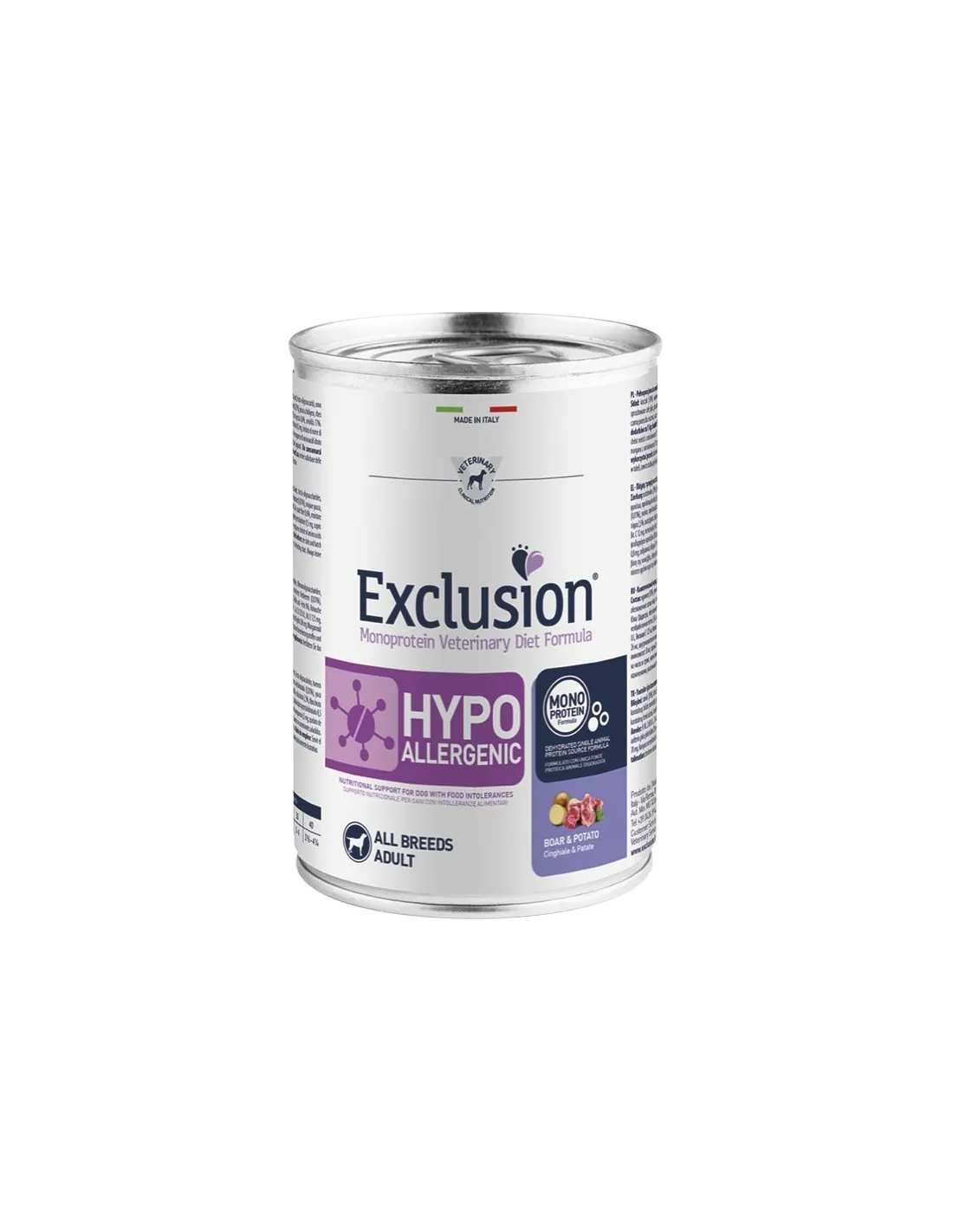 Exclusion Diet Jabalí Hipoalergénico y Patatas 400GR es un alimento húmedo monoproteico diseñado específicamente para perros con sensibilidad o intolerancia alimentaria. Su fórmula exclusiva incluye como única fuente proteica de jabalí, altamente digerible, asociada a la patata, elegida como única fuente de hidratos de carbono, ideal para reducir el riesgo de reacciones adversas a los alimentos. Este producto se presenta en forma de un paté suave y sabroso, fácilmente aceptable incluso para los perros más exigentes o con apetito reducido, gracias a su alta palatabilidad y consistencia blanda que permite una fácil masticación. Sin cereales añadidos, colorantes, conservantes ni saborizantes artificiales, garantiza una comida natural, segura y equilibrada todos los días. El alto contenido en carne de jabalí aporta proteínas de alta calidad, mientras que la presencia de patatas aporta energía de forma delicada al sistema digestivo, favoreciendo una digestión óptima incluso en los sujetos más delicados.