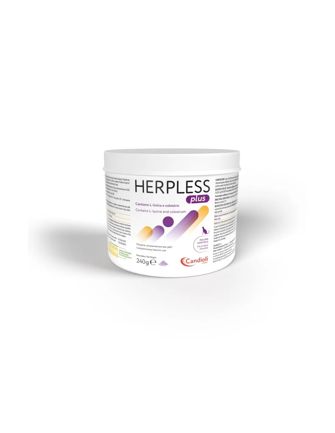 Candioli Herpless Plus es un polvo palatable de 240 gramos, formulado específicamente para el tratamiento del herpes en gatos. Este producto es un pienso complementario que contiene L-lisina y calostro, ingredientes clave para combatir las infecciones por el Virus del Herpes Felino (FHV-1).
