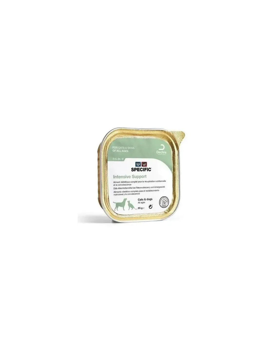 Specific Cat and Dog Intensive Support F/C-IN-W es un alimento húmedo para perros y gatos adultos. Este producto se vende en un paquete múltiple que contiene 7 paquetes de 95 g cada uno. Es un alimento húmedo para perros y gatos indicado para el manejo nutricional durante los periodos de recuperación de nutrientes y convalecencia de perros y gatos de todas las edades.