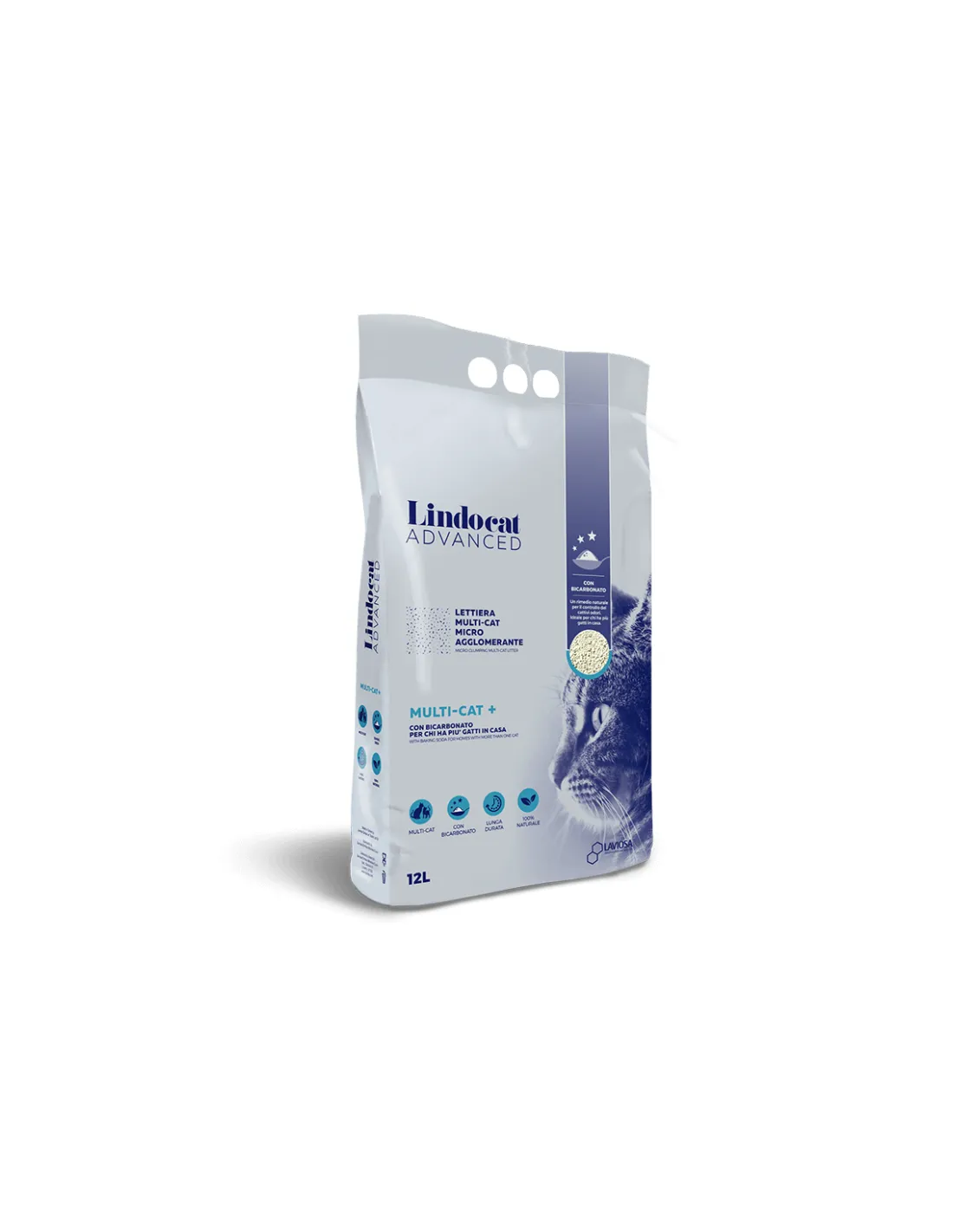 Lindocat Lettiera Advance Multi-Cat con Bicarbonato 12lt è una lettiera igienica agglomerante di alta qualità, composta al 100% da bentonite di pregiato ed unico colore bianco, a granulometria fine. Questa lettiera è stata specificamente formulata per chi possiede più gatti, garantendo un controllo efficace dei cattivi odori grazie all'aggiunta di bicarbonato.