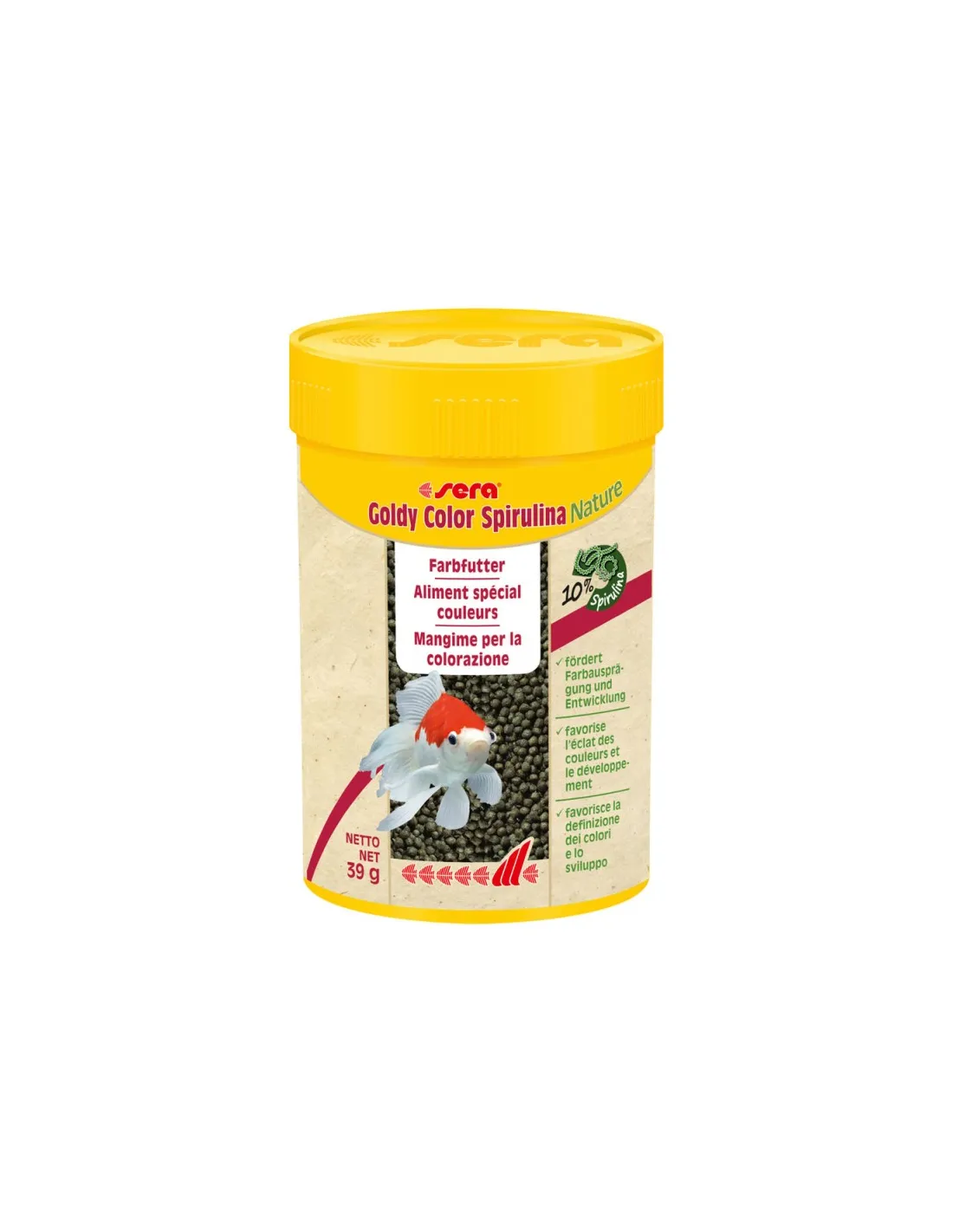 El "SERA Goldy Color Espirulina 100 ml" es un alimento premium para peces, diseñado para intensificar la coloración natural de los peces. Este producto es ideal para todo tipo de peces ornamentales, gracias a su fórmula equilibrada y de fácil digestión que asegura una nutrición completa.