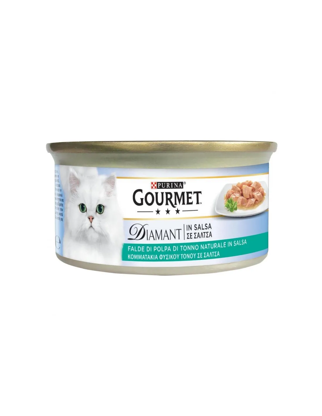 PURINA GOURMET Diamant en Salsa Exquisito Copos de Carne de Atún en Salsa Natural 85 g es un alimento complementario para gatos adultos. Este producto está compuesto principalmente por atún al natural, que supone el 63% de los ingredientes. Otros ingredientes incluyen subproductos de origen vegetal. Esta comida para gatos es rica en humedad (80%), proteínas (16%), grasa bruta (0,5%), ceniza bruta (1,5%) y fibra bruta (0,5%).