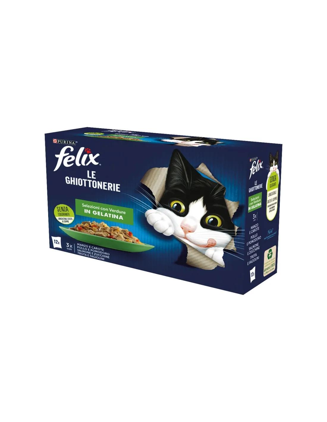 Purina Felix Le Ghiottonerie Selections con Verduras en Gelatina 12x85g es una comida húmeda para gatos, rica en nutrientes y vitaminas. Este producto ofrece una variedad de sabores sabrosos y nutritivos, con una selección de vegetales en gelatina.