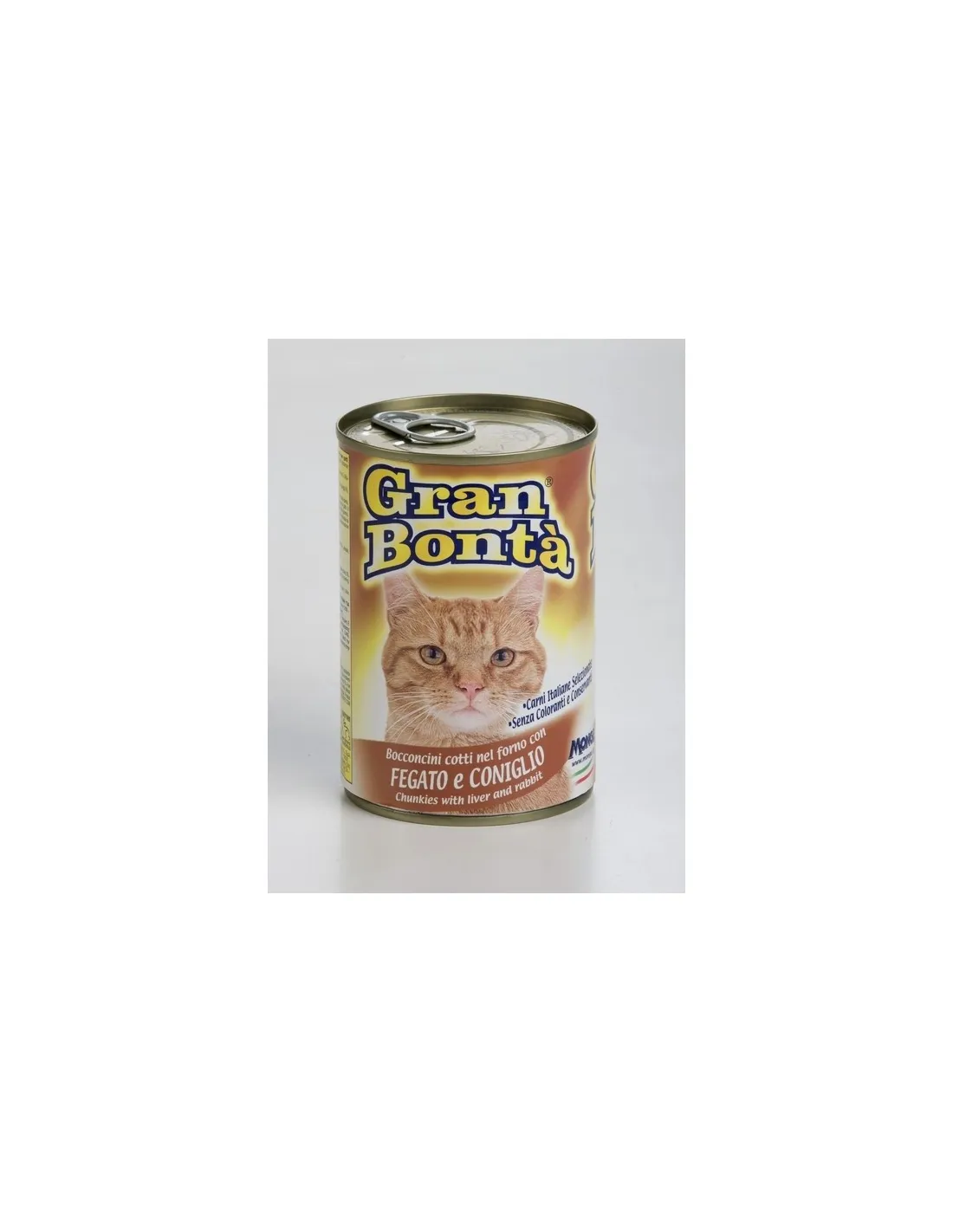 Gran Bontà Adult Bocconcini con Hígado y Conejo es un alimento completo para gatos adultos. Estos deliciosos bocados horneados están formulados con ingredientes de fácil digestión, como la carne y el hígado de conejo, que son excelentes fuentes de proteínas y minerales. Este alimento ha sido equilibrado con vitaminas A-D3-E para satisfacer las necesidades nutricionales de tu gato. No contiene colorantes ni conservantes artificiales añadidos y no ha sido probado en animales. Se produce en Italia y el paquete es de 400 gramos.