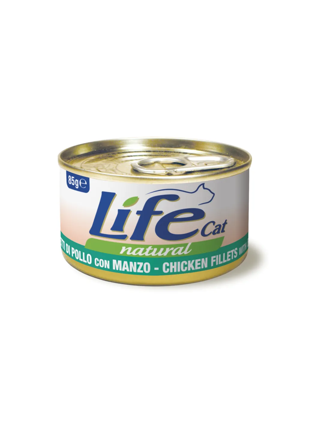 Elaborado con ingredientes naturales de alta calidad, Life Cat Natural asegura una dieta sana y nutritiva. Cada lata contiene filetes de pollo y ternera cuidadosamente seleccionados, combinados con el delicioso sabor del atún, para satisfacer hasta los paladares más exigentes.