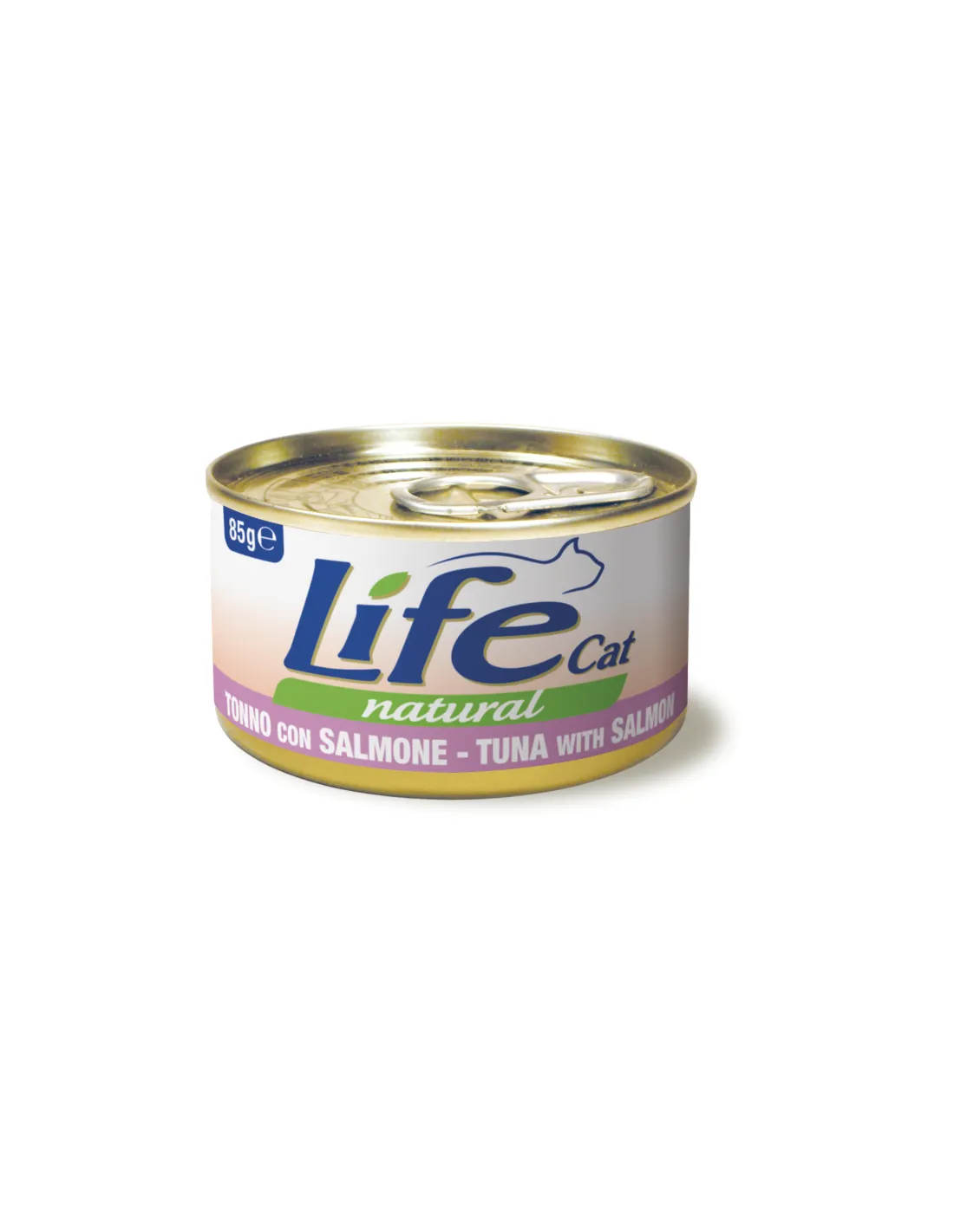 Life Cat Natural es una comida húmeda para gatos, presentada en una práctica lata de 85 g, que combina el delicioso sabor del atún con el del salmón. Este producto es ideal para cubrir las necesidades nutricionales de tu gato, ofreciéndole una comida rica en proteínas y sabores naturales.