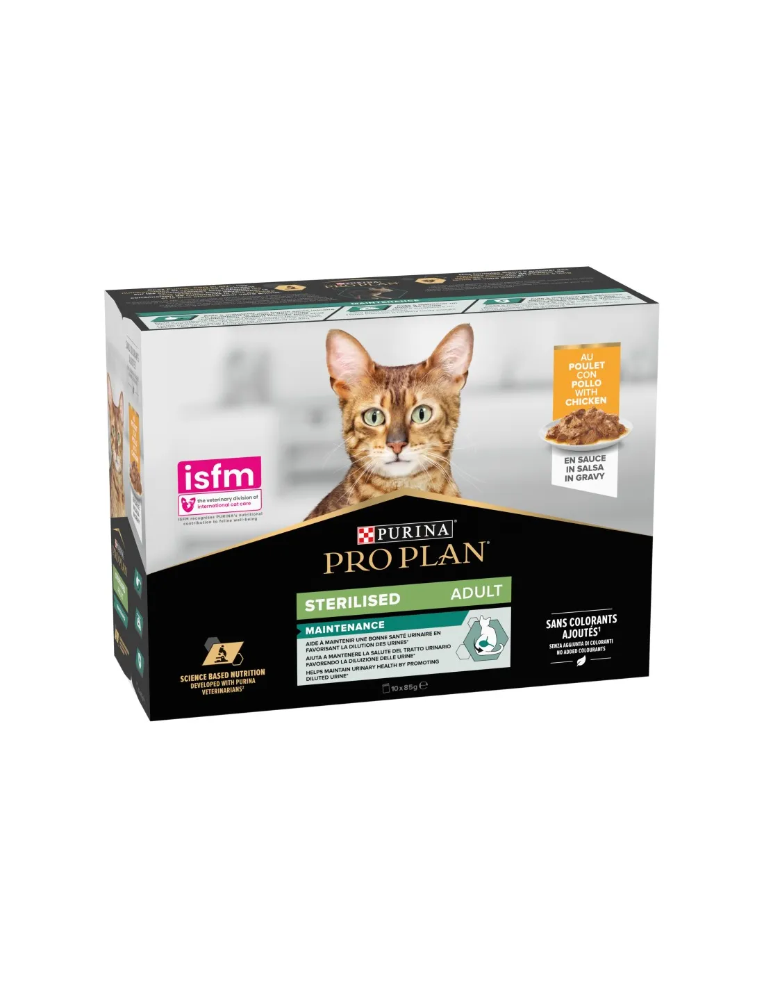 El “Pro Plan Nutrisavour Multipack para Gatos Esterilizados con Pollo en Salsa” está disponible en un cómodo formato que incluye 10 sobres de 85 gramos cada uno. Este formato de paquete múltiple es ideal para garantizar que las comidas estén siempre frescas y apetitosas, facilitando la gestión de las porciones y garantizando que la comida siga siendo sabrosa y atractiva en cada comida.