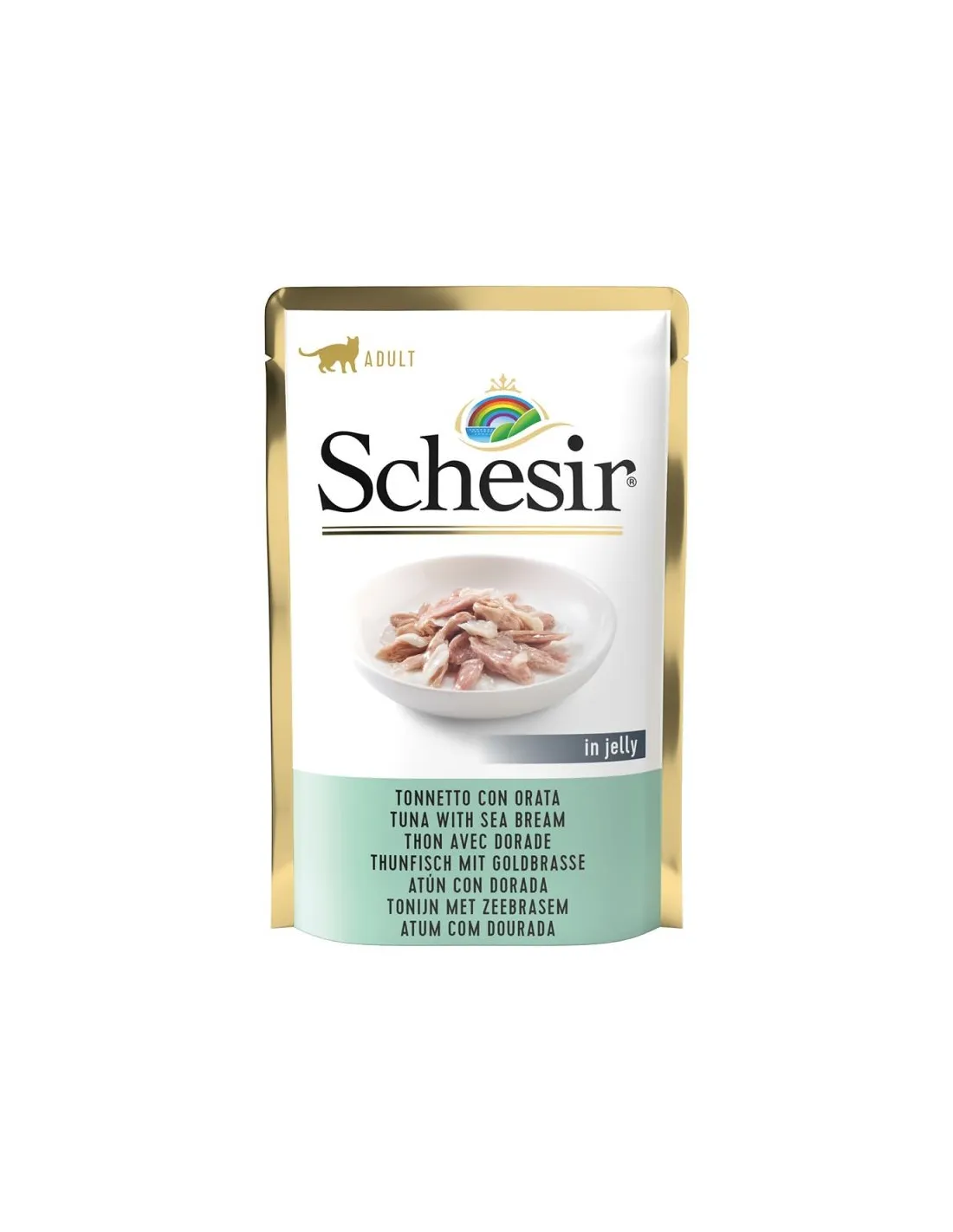 Schesir-Tonno-e-Orata-85-gr-Basta-Umido-Per-Catti es un alimento húmedo de alta calidad para gatos adultos, que combina el sabor del atún con el de la dorada en una suave gelatina. Cada envase contiene 20 sobres de 85 gramos, para un total de 1,7 kg de producto.