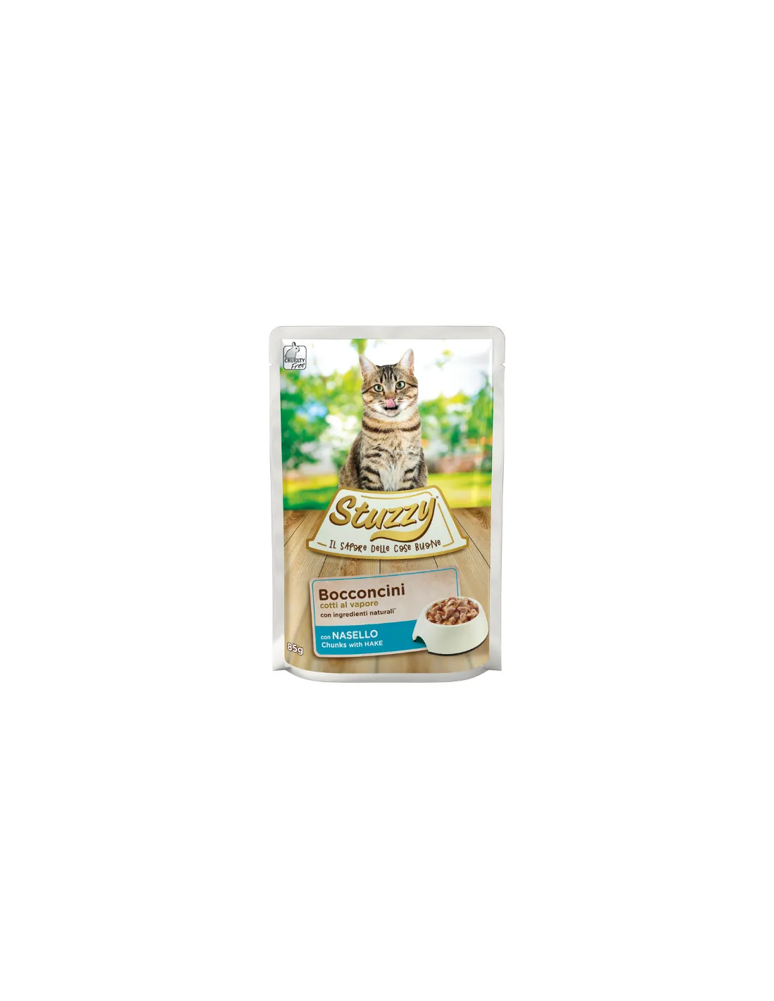 El producto “Bocconcini con merluza” de Stuzzy es una comida húmeda para gatos, preparada con ingredientes naturales y cocida al vapor para conservar el auténtico sabor y propiedades nutricionales de la merluza. Estos bocados son ideales para satisfacer el paladar de los gatos más exigentes, ofreciéndoles una comida sabrosa y saludable.