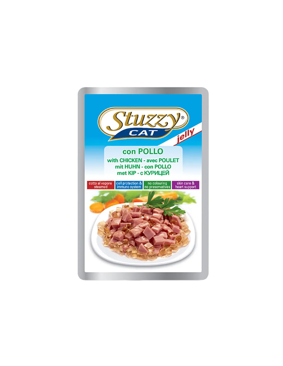 Stuzzy Bocconcini Jelly with Chicken está formulado específicamente para gatos adultos de todas las razas. Está especialmente indicado para gatos con necesidades nutricionales estándar que no requieren una dieta especial. Este producto contribuye al mantenimiento de un peso corporal saludable y apoya las funciones vitales del gato.