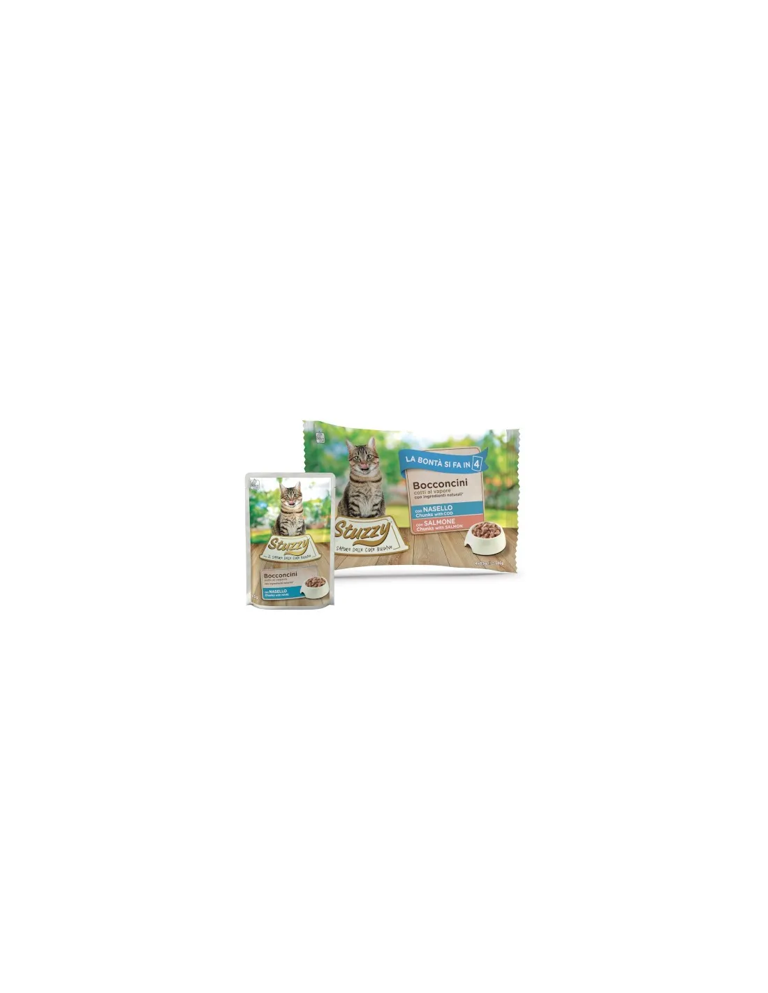 Stuzzy Cat Adult Bocaditos de Merluza y Salmón 4x85gr ofrece una nutrición completa y equilibrada para tu gato adulto. Este multipack contiene trocitos en salsa, preparados con ingredientes naturales y cocidos al vapor para mantener intactas las propiedades nutricionales y el sabor original del pescado. El paquete incluye cuatro sobres de 85 gramos cada uno, dos con sabor a merluza y dos con sabor a salmón, asegurando variedad y placer a tu felino.