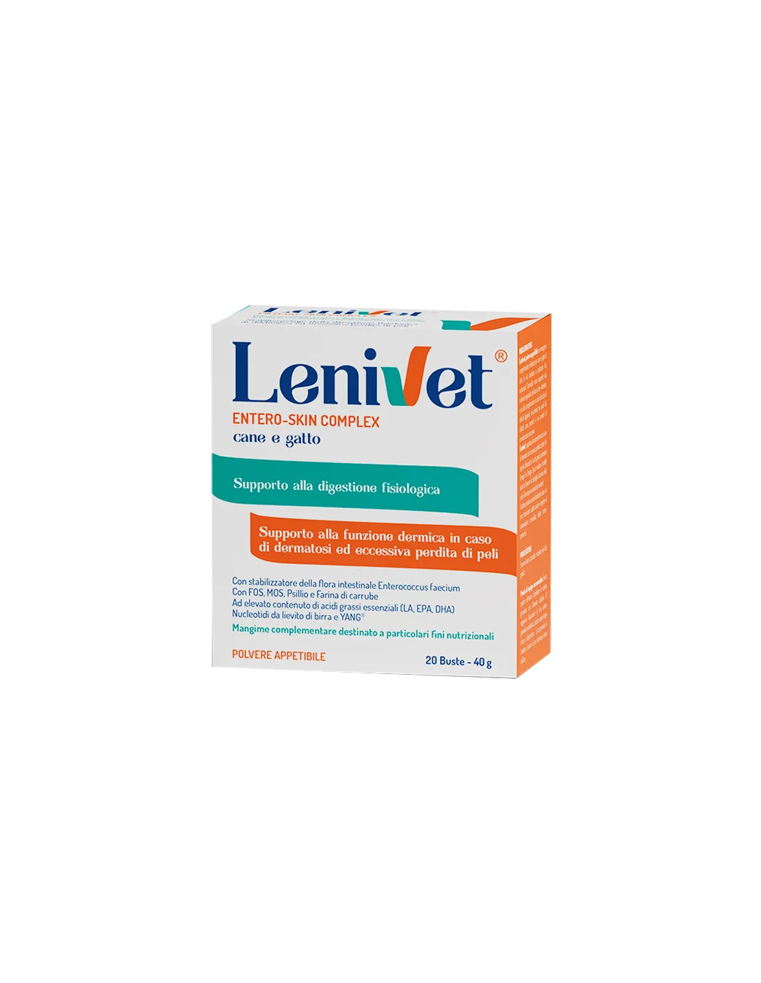 Lenivet polvo palatable es un pienso complementario dietético para perros y gatos de todas las edades destinado a fines nutricionales particulares. Formulado como apoyo a la regularidad natural del eje piel-intestino, es un complemento útil en caso de riesgo de trastornos digestivos, en periodos en los que dichos trastornos están presentes o en periodos de convalecencia posteriores. Lenivet favorece la función dérmica en caso de dermatosis y caída excesiva del cabello. Un aporte equilibrado de ácidos grasos poliinsaturados omega 6 y 3 puede ser de válida ayuda para favorecer la barrera fisiológica de la piel y el bienestar natural del pelaje.