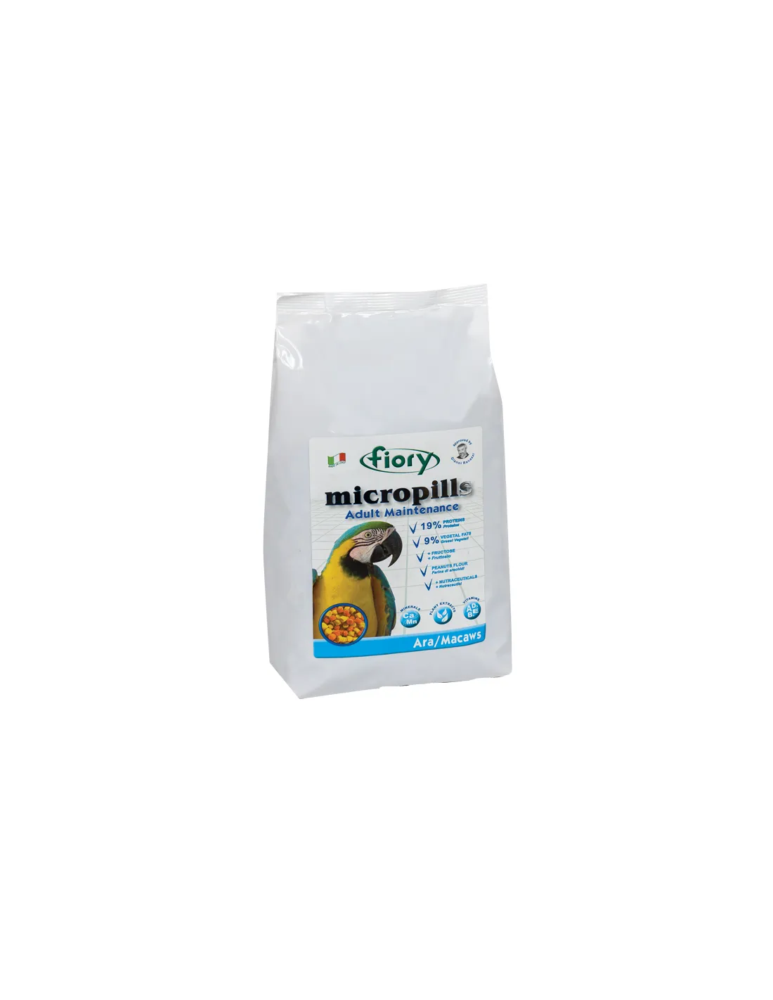 Este pienso está destinado principalmente a sujetos granívoros-frugívoros, siendo la fructosa la principal fuente de hidratos de carbono. Con un contenido de proteína del 19 % y un contenido de grasa del 9 %, Fiory Micropills Adult For Macaw proporciona el equilibrio adecuado de nutrientes necesarios para la salud y el bienestar de su guacamayo.