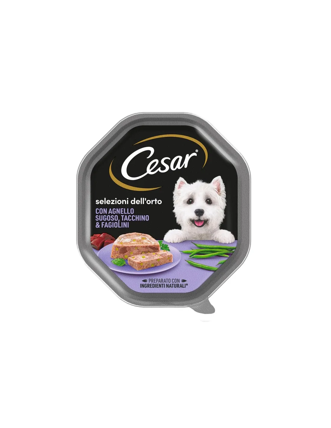 La composición de Cesar® Selezioni dell'Orto con jugosos cordero, pavo y judías verdes incluye carne y derivados (60%, de los cuales 4% cordero, 4% pavo), cereales, sustancias minerales, subproductos de origen vegetal, extractos de proteínas vegetales. Los componentes analíticos son Proteína bruta: 10 Aceites y grasas brutos: 5 Cenizas brutas: 2 Fibra bruta: 0,4 Humedad: 81. Los aditivos incluyen vitamina D₃, yodato de calcio anhidro, sulfato de cobre pentahidratado, monohidrato de sulfato ferroso, monohidrato de sulfato de manganeso, monohidrato de sulfato de zinc, goma casia y nitrito de sodio.