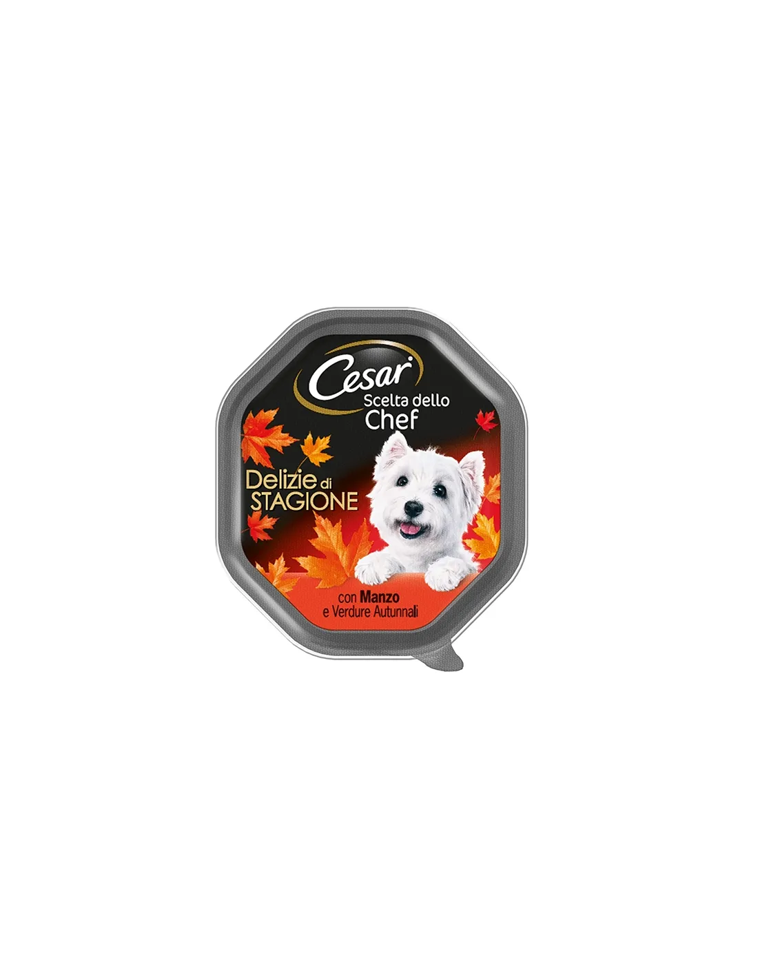 Cesar Dog Chef's Choice Con Carne, Patatas y Zanahorias es un alimento completo y equilibrado para perros adultos. Su composición garantiza un aporte de nutrientes esenciales para el bienestar de tu perro. Las proteínas derivadas de la carne de vacuno contribuyen al mantenimiento de la masa muscular, mientras que los cereales aportan la energía necesaria para una actividad física constante. Por último, las verduras son fuente de fibra, útil para el correcto funcionamiento del sistema digestivo.