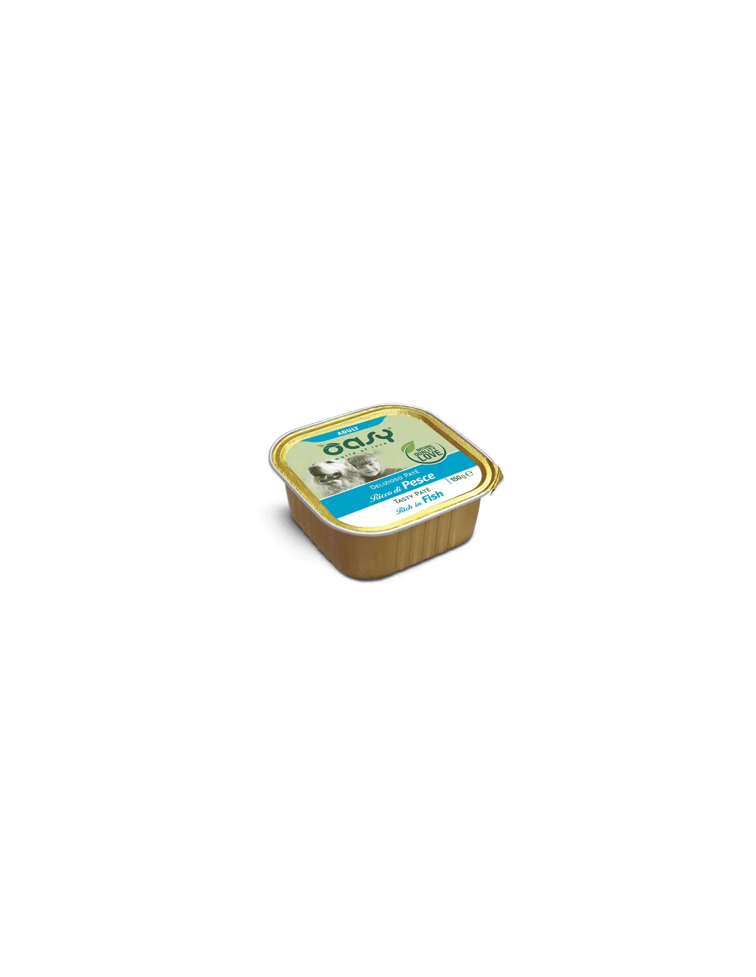 Oasy Dog Delicious Patè Adult con Pescado es un alimento húmedo completo para perros adultos de todos los tamaños. Este paté está elaborado con ingredientes de alta calidad, asegurando una comida nutritiva y apetitosa.