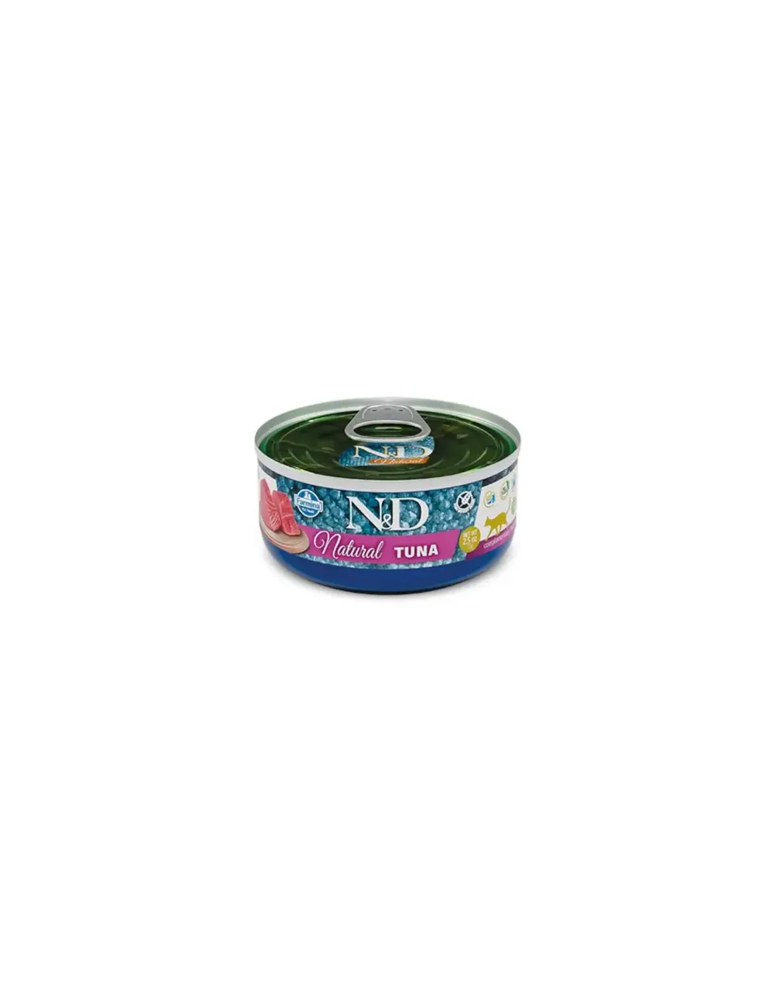 Farmina N&D Natural - Atún al Natural - Lata 70 g es un alimento complementario para gatos adultos que destaca por su fórmula sencilla y natural. El atún claro, ingrediente principal de este producto, constituye el 70% de la composición, garantizando un aporte proteico de alta calidad. El caldo de pescado añade sabor y humedad, haciendo que cada bocado sea irresistible para tu felino.