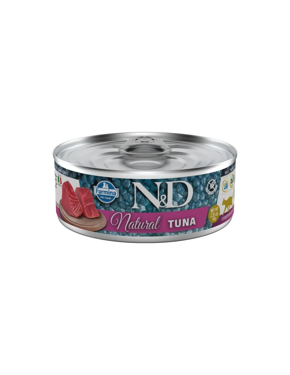 Farmina N&D Natural Atún es un alimento húmedo complementario para gatos adultos, que destaca por su fórmula sencilla y natural. El atún claro, ingrediente principal, constituye el 70% de la composición, asegurando un alto aporte de proteínas de calidad. El caldo de pescado enriquece el sabor y aumenta la hidratación, haciendo que cada comida no sólo sea nutritiva sino también extremadamente sabrosa.
