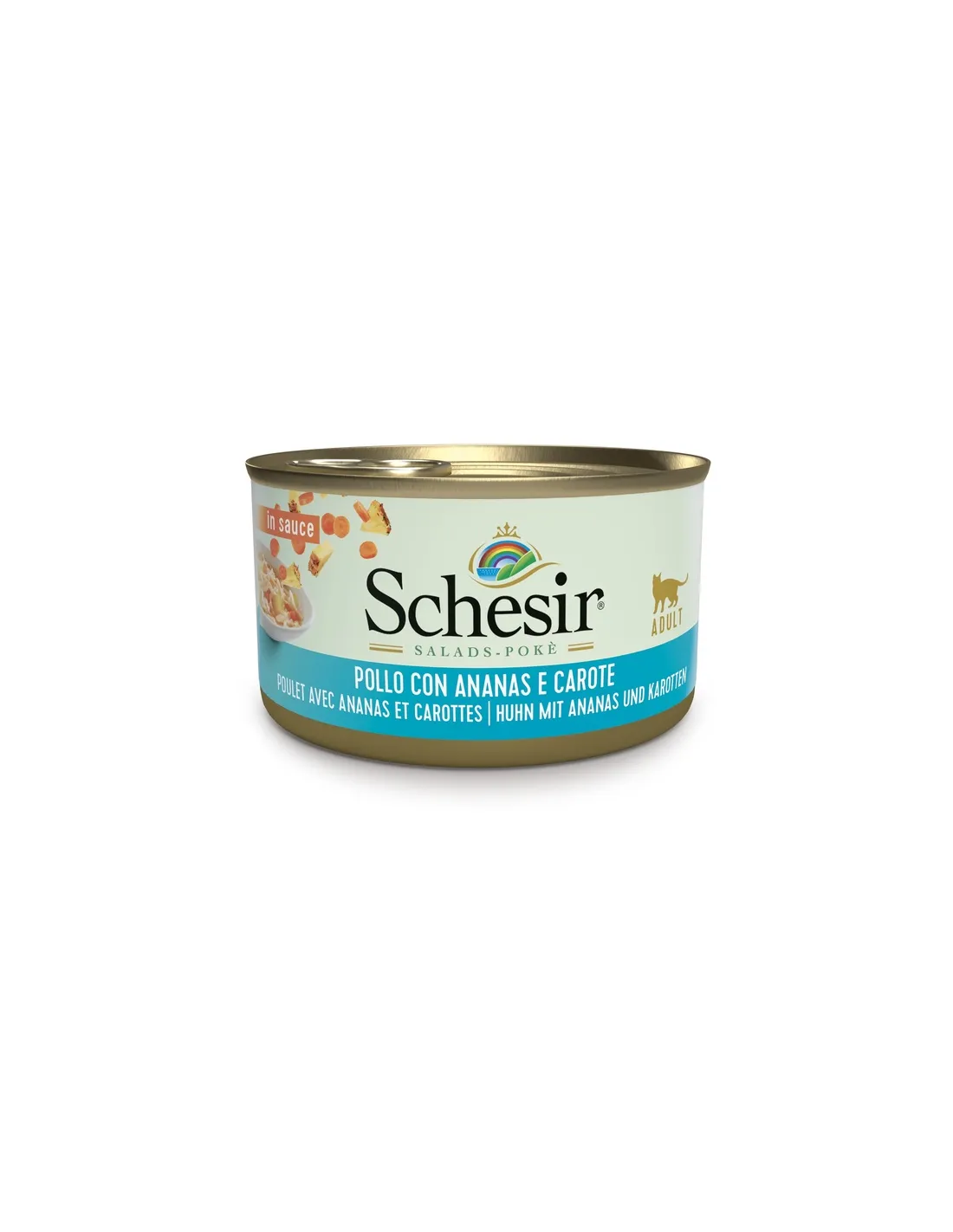 La elección de ingredientes naturales y una cuidadosa preparación hacen de Schesir un alimento húmedo que favorece la salud de su gato a largo plazo. La receta fue desarrollada para garantizar una ingesta equilibrada de nutrientes esenciales, promoviendo una digestión óptima y apoyando el sistema inmunológico. La consistencia gelatinosa no sólo agrada a los gatos, sino que también facilita la ingesta de alimentos en gatos con sensibilidad dental o de encías. Además, la fórmula sin cereales es ideal para gatos con sensibilidades o alergias alimentarias.