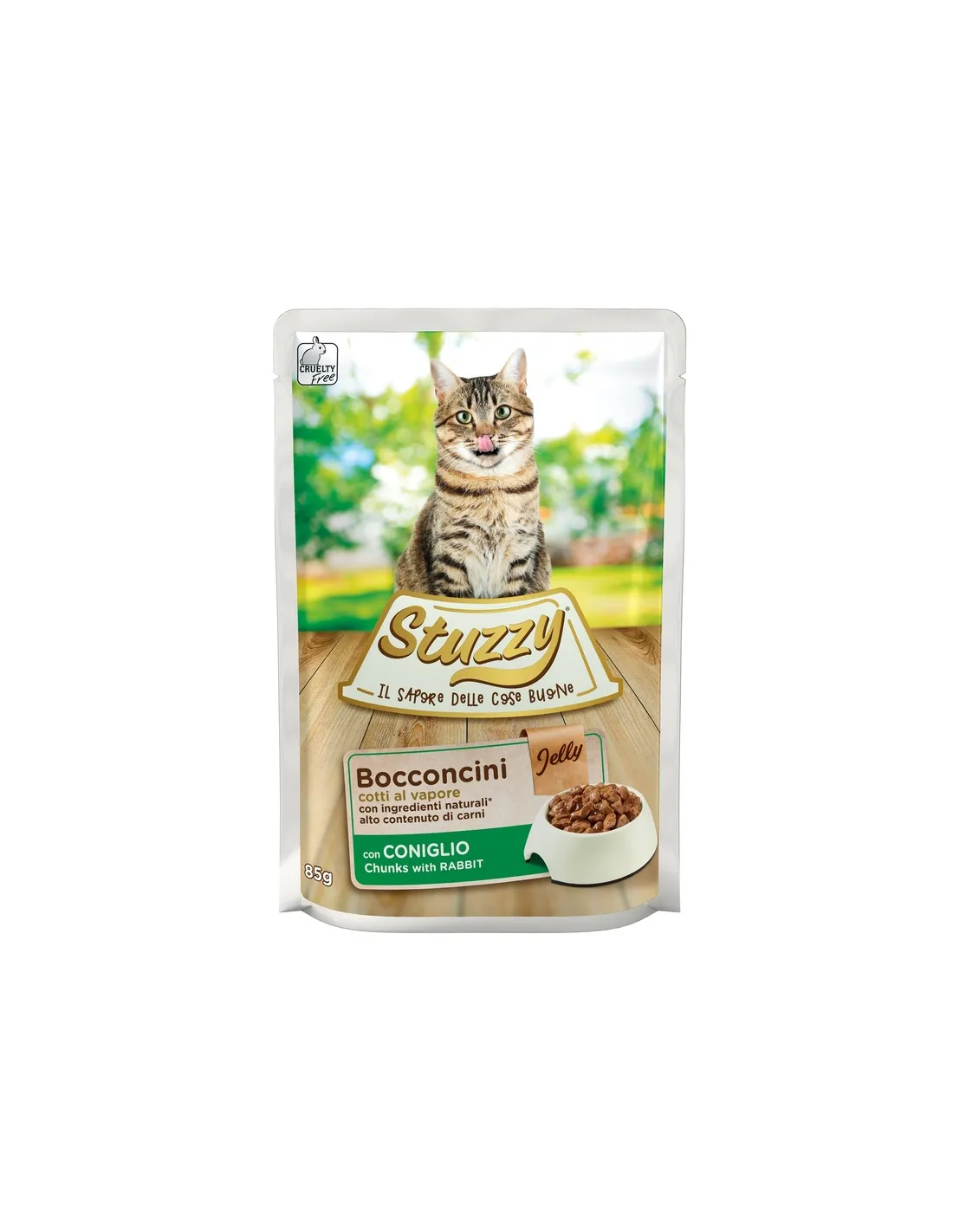 La composición de Stuzzy Bocconcini Jelly with Rabbit ha sido diseñada para cubrir las necesidades nutricionales de los gatos adultos. El producto contiene un 45% de carne y derivados, de los cuales un 8% es conejo, aportando una fuente de proteínas de alta calidad. Se incluyen subproductos de origen vegetal, como la inulina de achicoria (0,4%), para favorecer la digestión y la salud intestinal. Las sustancias minerales son fundamentales para el correcto funcionamiento del organismo del gato. Los aditivos nutricionales, como la vitamina D3, la vitamina E, la biotina, la taurina, el zinc (monohidrato de sulfato de zinc) y el manganeso (monohidrato de sulfato de manganeso), han sido seleccionados por sus propiedades beneficiosas, que contribuyen al mantenimiento de una piel sana, un pelaje brillante y una vista aguda. Los componentes analíticos, con un porcentaje de proteína del 7,5%, fibras brutas 0,3%, grasas brutas 4%, ceniza bruta 2% y humedad 82%, confirman el equilibrio nutricional de este alimento húmedo.