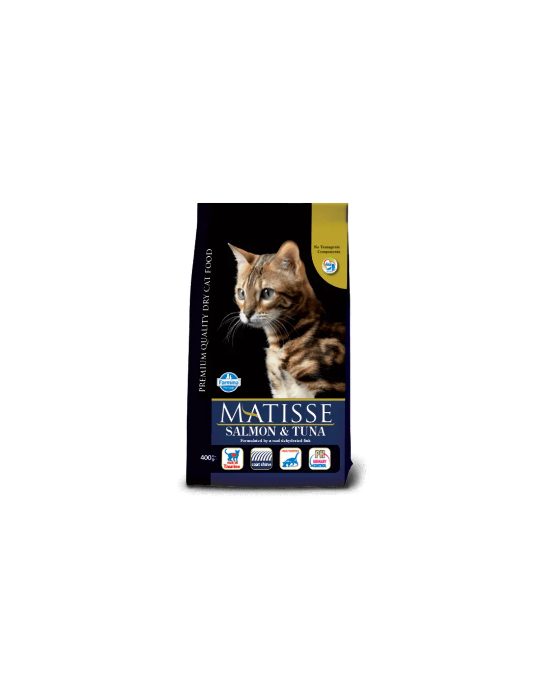 Pescado deshidratado (salmón 10%, atún 10%), arroz (20%), carne de pollo deshidratada, maíz, grasa de pollo, hidrolizado de proteínas animales, pulpa de remolacha deshidratada, aceite de pescado, aceite vegetal, gluten de maíz, huevos enteros deshidratados, cloruro sódico, cloruro potásico, sulfato cálcico dihidrato, cerveza deshidratada. levadura.