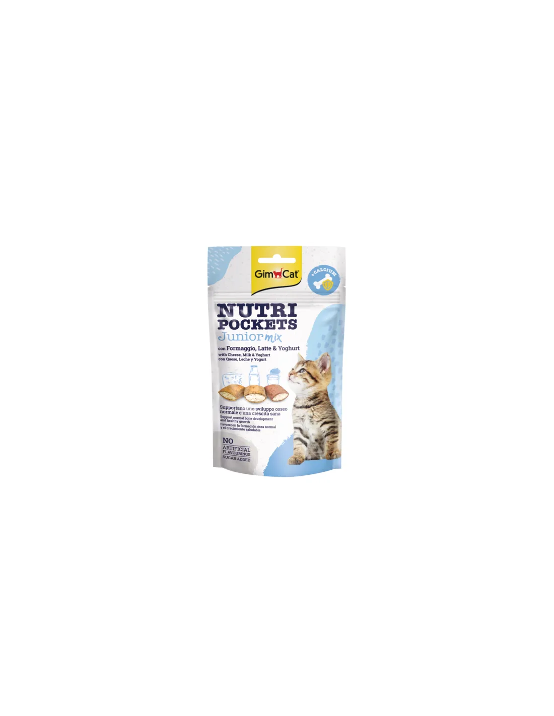 Ingredientes principales: GimCat Nutri Pockets Junior Mix están elaborados con ingredientes de alta calidad, libres de azúcares añadidos, saborizantes y colorantes artificiales. Contienen un alto nivel de calcio, vitaminas esenciales y taurina, todos ellos importantes para favorecer el crecimiento y desarrollo de los gatitos.
