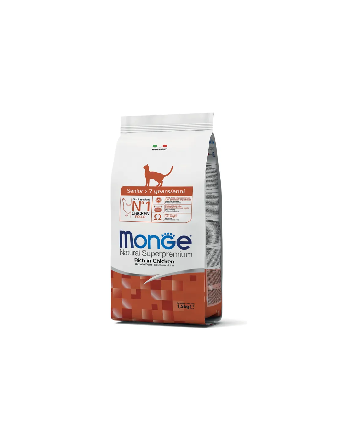 Es un alimento completo y equilibrado para gatos senior. El primer ingrediente es el pollo y la formulación se caracteriza por su digestibilidad y palatabilidad gracias a la inclusión de carne fresca. La formulación está enriquecida con xos (xilooligosacáridos), prebióticos de última generación que favorecen el bienestar intestinal. La inclusión de ingredientes refinados, como el escaramujo con componentes antioxidantes para ayudar a neutralizar los radicales libres y la yuca schidigera para controlar los olores intestinales, es el resultado de una investigación Made in Italy para apoyar la calidad de vida de nuestros gatos ancianos. Formulación con aceite de salmón, fuente de ácidos grasos omega-3, para un cabello brillante.
