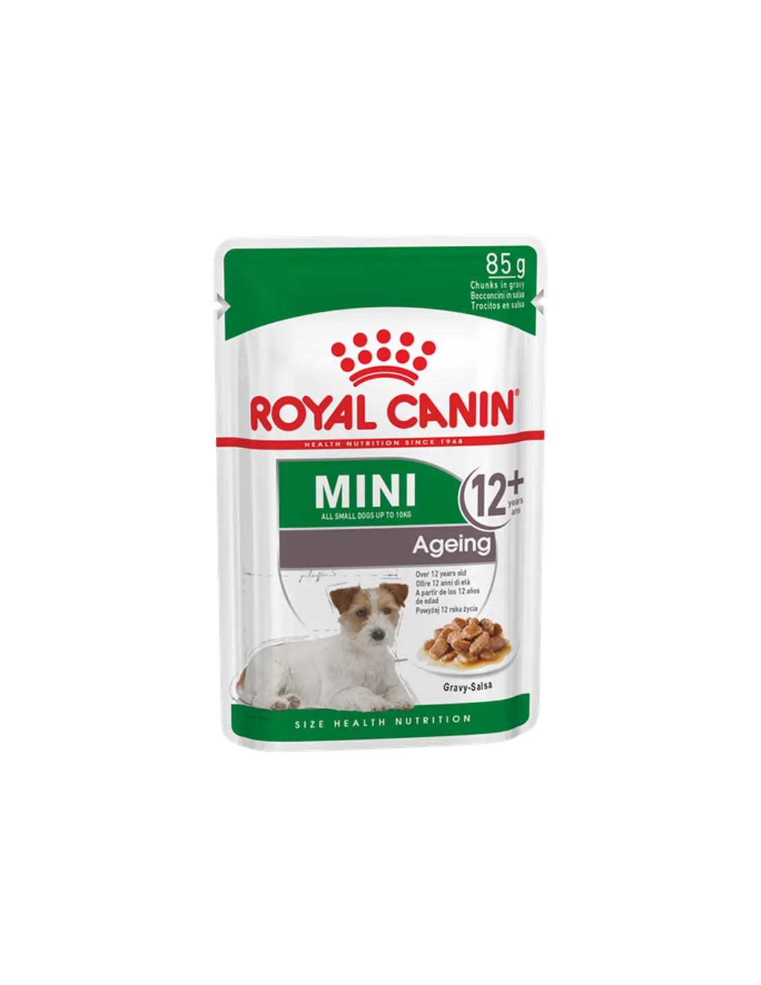 Royal Canin Mini Aging 12+ es un alimento húmedo específicamente formulado para perros pequeños de edad avanzada. Envasado en prácticas bolsas de 85 gramos, este producto ofrece un alimento en salsa nutritivo y apetitoso, ideal para satisfacer las necesidades específicas de los perros mayores.