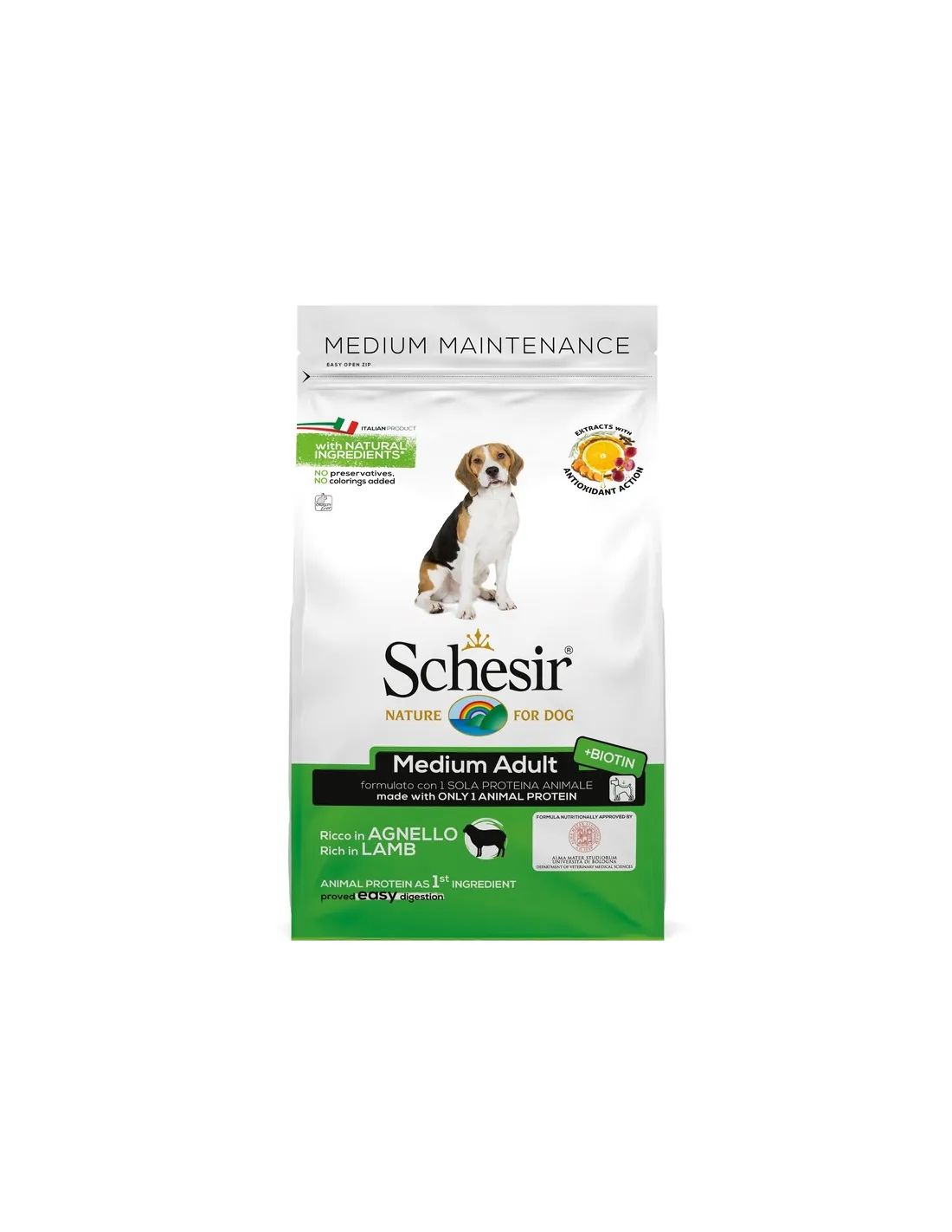 El "Adulto mediano con cordero 3kg" es un pienso seco completo y equilibrado, ideal para perros adultos de tamaño mediano de todas las razas. Este producto destaca por tener el cordero como única fuente de proteína animal y primer ingrediente, garantizando una dieta sabrosa y de fácil digestión. La presencia de levadura de cerveza y biotina contribuye al mantenimiento de un pelaje brillante y de una piel sana, mientras que una mezcla especial de extractos de plantas aromáticas proporciona una acción antioxidante sinérgica. La fórmula, libre de colorantes y conservantes añadidos, fue desarrollada siguiendo una filosofía libre de crueldad animal. También disponible en un formato más grande de 12000 g, este producto representa una excelente opción para mantener el bienestar diario de su perro.