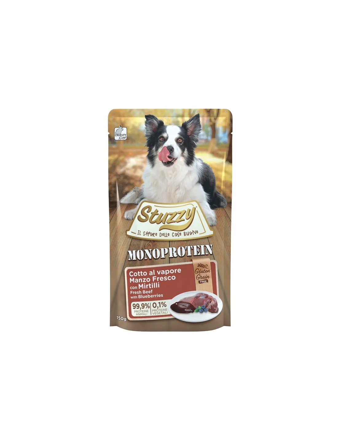 Stuzzy Cane Monoprotein Beef con Arándanos es un alimento húmedo de alta calidad para perros adultos que garantiza una excelente digestibilidad gracias a su fórmula monoproteica. Este producto es ideal para perros con sensibilidad alimentaria o intolerancia al gluten y a los cereales, ya que es completamente libre de cereales y gluten. La cocción al vapor preserva la integridad y las bondades de los ingredientes naturales, ofreciendo a su perro una comida sabrosa y nutritiva. La composición del producto se basa en un alto porcentaje de carne de vacuno fresca, enriquecida con arándanos, que aportan antioxidantes naturales, y aceite de linaza, fuente de ácidos grasos esenciales. Los aditivos nutricionales están equilibrados para cubrir las necesidades diarias de tu perro, asegurando la correcta ingesta de vitaminas y minerales.