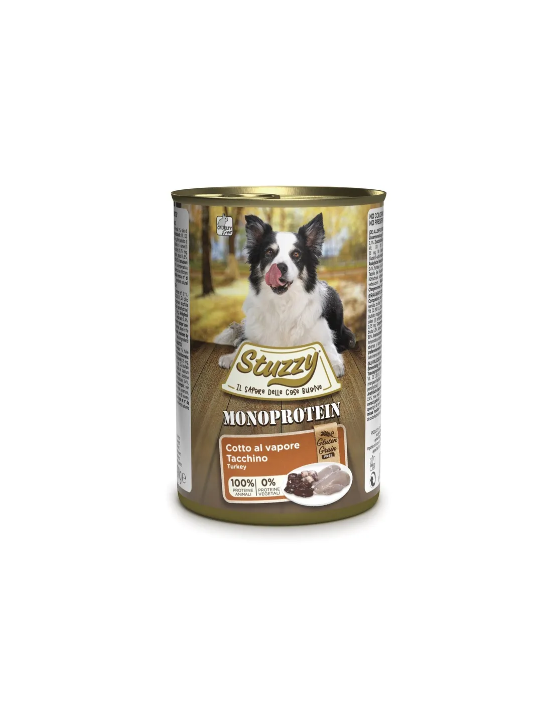 Stuzzy Dog Monoprotein Pavo es un alimento húmedo para perros de alta calidad, formulado para cubrir las necesidades nutricionales de nuestros amigos de cuatro patas. Este producto destaca por ser monoproteico, es decir, contiene una sola fuente de proteínas, el pavo, lo que está especialmente indicado para perros con sensibilidad o alergia alimentaria. La fórmula sin cereales garantiza la ausencia de cereales, por lo que también es adecuada para perros con intolerancias o dificultades digestivas relacionadas con estos ingredientes.
