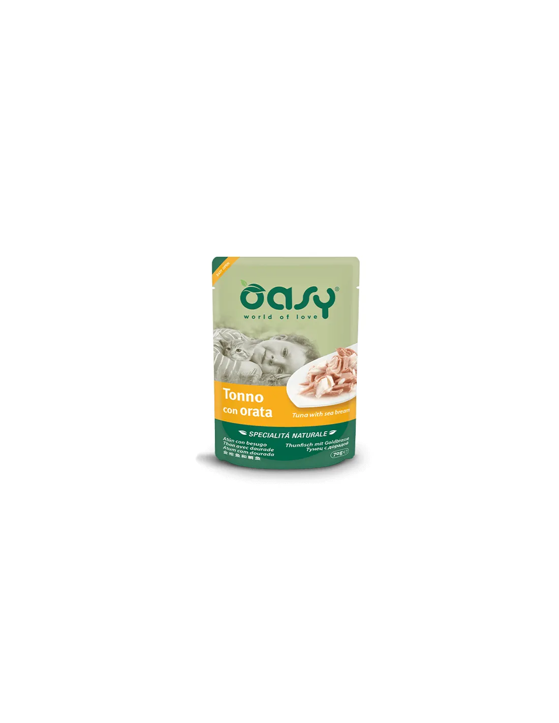 El producto “Especialidad Natural Atún con Dorada” de Oasy es un alimento húmedo natural para gatos adultos, que combina ingredientes de alta calidad en una delicada gelatina. Este alimento complementario está elaborado con atún y dorada, sin adición de colorantes, conservantes ni aperitivos artificiales, garantizando así una alta palatabilidad. Cada sobre contiene 70 g de producto, ideal para enriquecer la dieta diaria de tu gato con una comida sabrosa y saludable.
