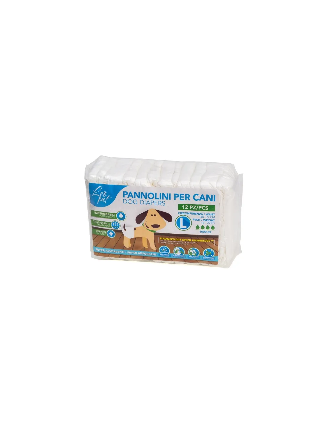 LEOPET - 12 Pañales Súper Absorbentes para Perros Talla L están diseñados para ofrecer una solución higiénica y cómoda a perros en celo o que sufren de incontinencia. Estos pañales son ideales para mantener limpias las superficies internas y externas, evitando accidentes desagradables y garantizando al mismo tiempo el confort de tu mascota.