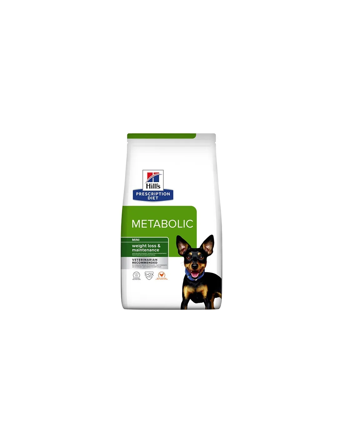 PD Metabolic Dog Mini 1KG es un alimento dietético específicamente formulado para favorecer la pérdida y el mantenimiento del peso en perros de razas pequeñas. Gracias a una mezcla exclusiva de ingredientes cuidadosamente seleccionados y un aporte calórico controlado, representa la solución óptima para controlar el exceso de peso y los problemas de salud relacionados en mascotas de tamaño mini. La palatabilidad del producto, combinada con el pequeño tamaño de la croqueta, permite una administración fácil y agradable que facilita el cumplimiento del programa dietético por parte del animal.