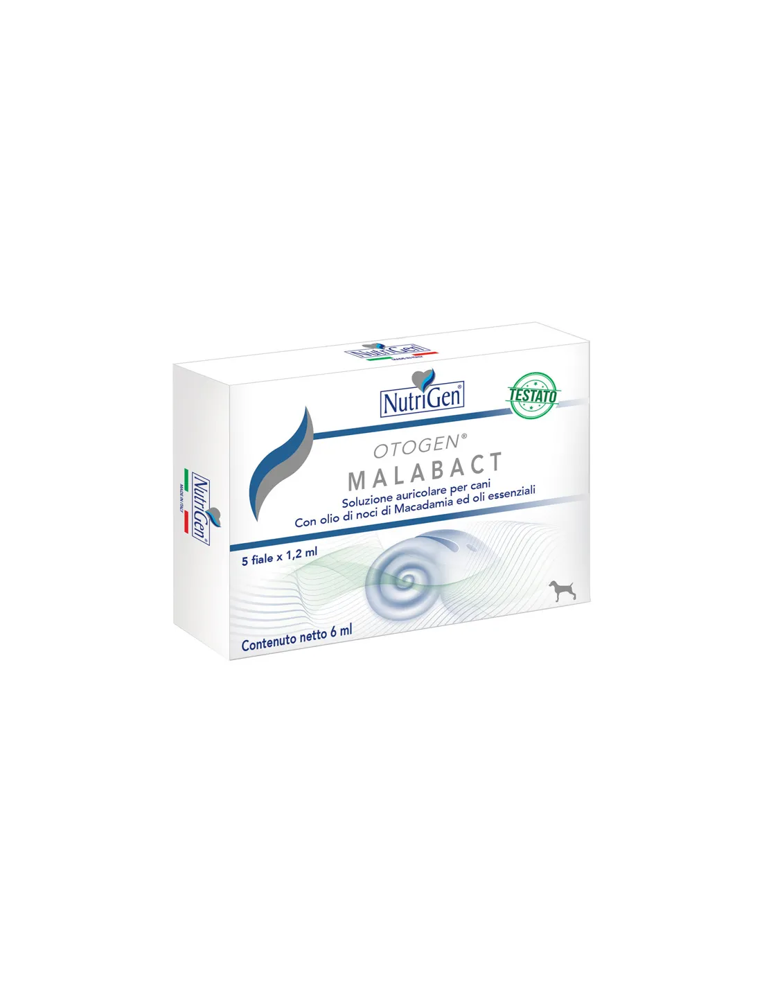 NutriGen OTOGENMALABACT es una solución oleosa, sin agua, para la limpieza de la piel de las orejas de los perros. Su formulación a base de lípidos, enriquecida con aceite de nuez de macadamia, no deja residuos en la piel y restaura la película hidrolipídica natural durante la limpieza. Gracias a la presencia de aceites esenciales, el uso repetido del producto ayuda a proteger la piel del oído y refuerza la función barrera natural de la piel, creando una película protectora contra las agresiones de los agentes externos, atmosféricos y bacterianos. La acción protectora de los aceites esenciales contenidos en OTOGEN MALABACT ayuda a calmar la piel en caso de aparición de irritaciones. La fórmula está enriquecida con aceite de Helianthus annus, un emoliente natural, rico en vitamina E y ácidos grasos insaturados, en particular ácido oleico y linoleico. No contiene conservantes, SLS/SLES. El producto está destinado a uso veterinario y no a uso humano, específicamente para perros. El formato es de 5 viales de 1,2 ml.