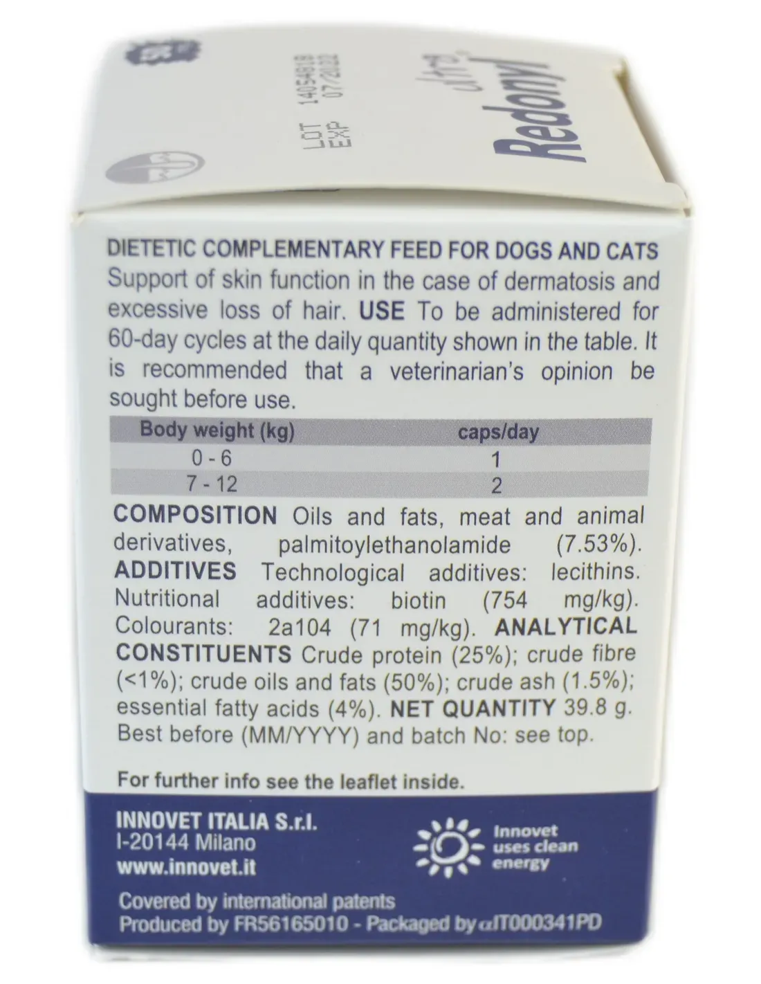 Administrar el producto durante ciclos de 60 días. Peso corporal (kg): 0-6: cps/día de redonyl 50 mg: 1 peso corporal (kg): 7-12: cps/día de redonyl 50 mg: 2 peso corporal (kg): 13-19: cps/día de redonyl 150 mg: 1 peso corporal (kg): 20-35: cps/día de redonyl 150 mg: 2 peso corporal (kg): >35: cps/día de redonyl 150 mg: 3 abrir la cápsula de bolo y exprimir el contenido en la boca del animal o mezclarlo con la ración de alimento. Alternativamente, las cápsulas de birillo se pueden tragar enteras.