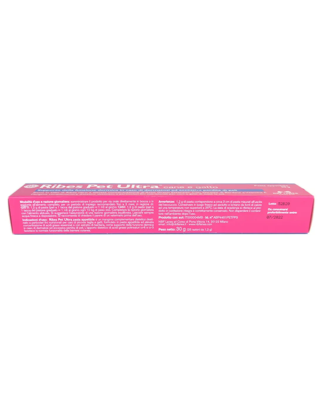 Ribes pet pasta palatable es un pienso complementario dietético destinado a fines nutricionales especiales para perros y gatos pequeños, formulado en una pasta palatable con una alta concentración de ácidos grasos esenciales y con extracto de bardana, como apoyo a la función dérmica en caso de dermatosis y caída excesiva del cabello. La ingesta dietética de ácidos grasos poliinsaturados w-6 y w-3 promueve la funcionalidad normal de la barrera cutánea.