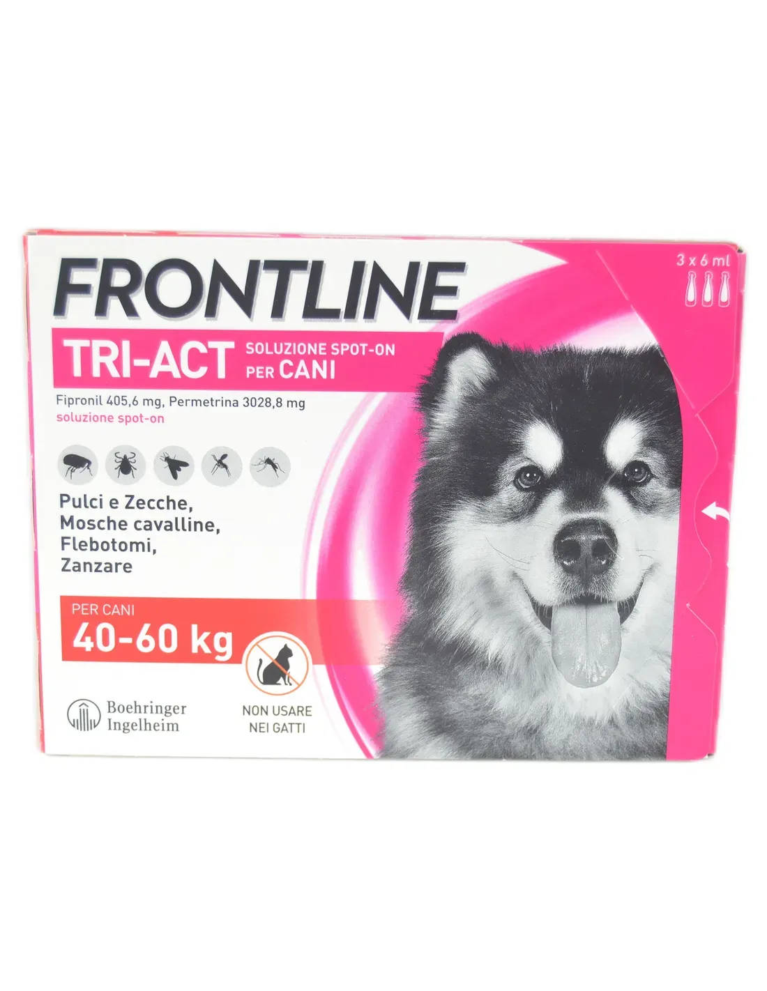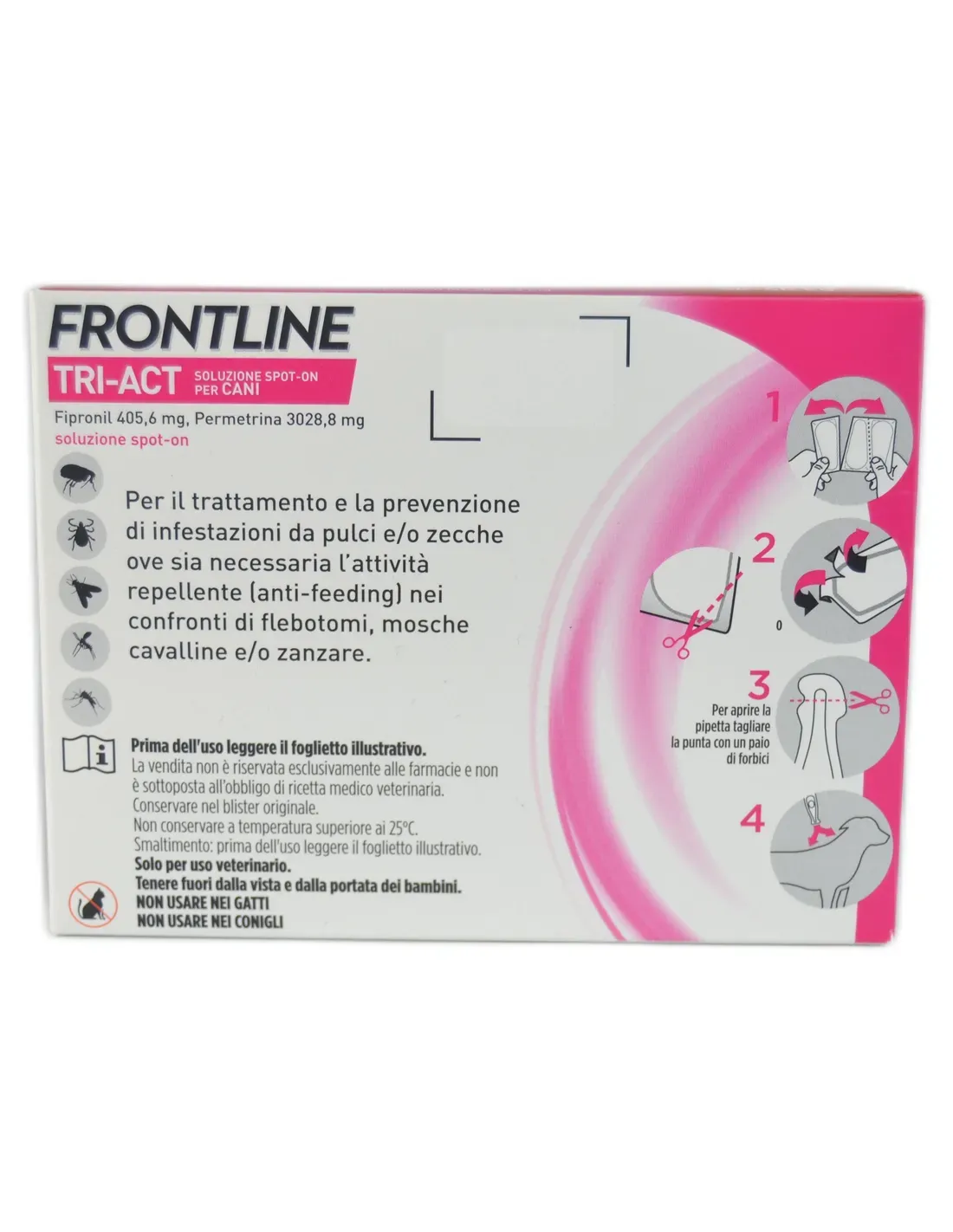 Para aplicación tópica en la piel (uso puntual). La siguiente tabla indica la pipeta a utilizar en función del peso del perro: solución spot-on frontline tri-act para perros: perros muy pequeños de 2 a 5 kg; volumen de dosis única (ml): 0,5; fipronilo (mg): 33,8; permetrina (mg): 252,4 solución de aplicación puntual tri-act de primera línea para perros: perros pequeños de 5 a 10 kg; volumen de dosis única (ml): 1; fipronilo (mg): 67,6; permetrina (mg): 504,8 solución de aplicación puntual tri-act de primera línea para perros: perros medianos de 10 a 20 kg; volumen de dosis única (ml): 2; fipronilo (mg): 135,2; permetrina (mg): 1009,6 solución para aplicación puntual tri-act de primera línea para perros: perros grandes de 20 a 40 kg; volumen de dosis única (ml): 4; fipronilo (mg): 270,4; permetrina (mg): 2019.2 solución de aplicación puntual tri-act de primera línea para perros: perros muy grandes de 40 a 60 kg; volumen de dosis única (ml): 6; fipronilo (mg): 405,6; permetrina (mg): 3028.8 solución spot-on tri-act de primera línea para perros: perros> 60 kg: utilice la combinación adecuada de las pipetas anteriores. Para perros que pesen más de 60 kg, utilice la combinación correcta de dos tamaños de pipeta que se corresponda lo más posible con el peso corporal del perro.