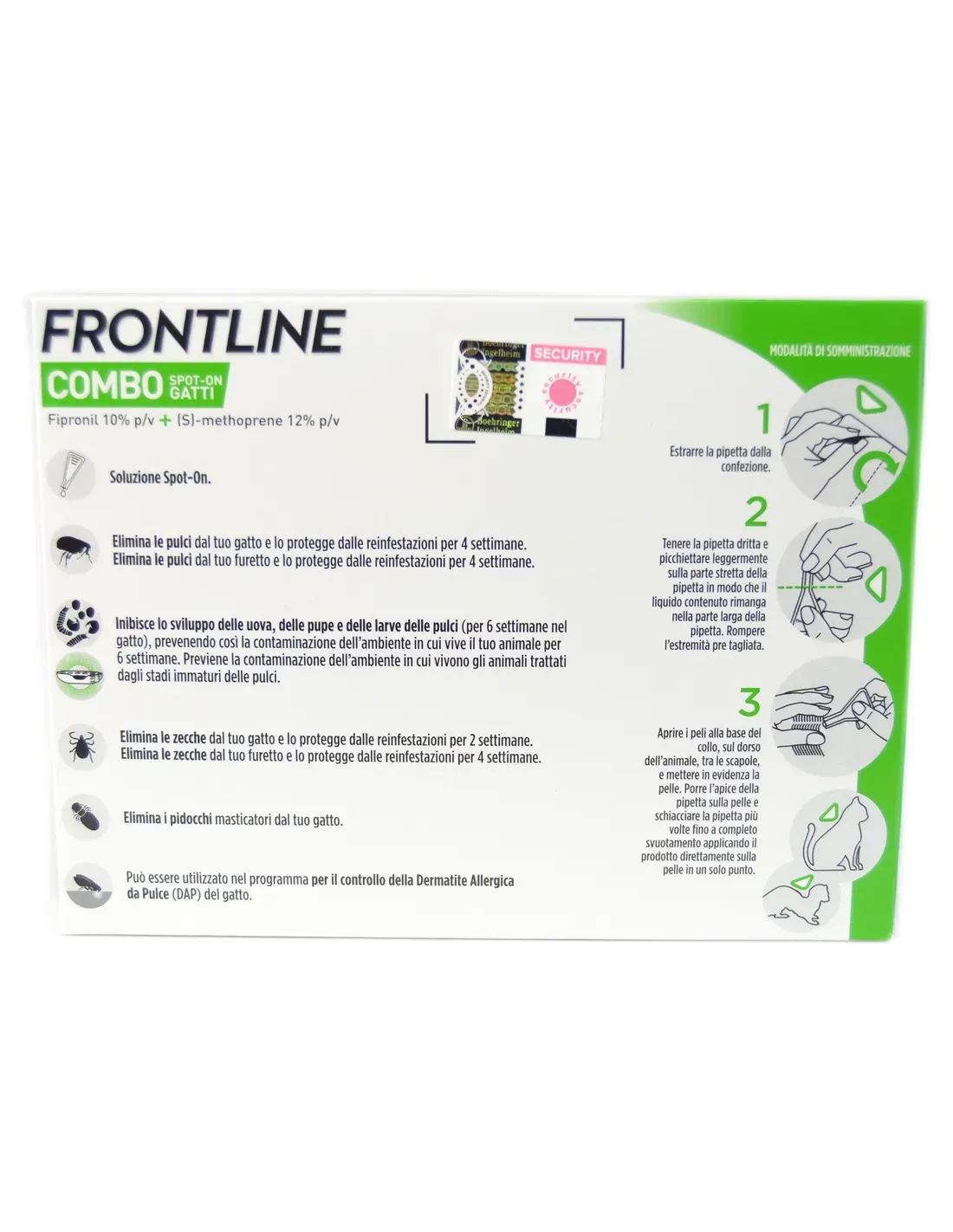 Dosificación: una pipeta de 0,5 ml por gato, correspondiente a la dosis mínima recomendada de 5 mg/kg de fipronilo y 6 mg/kg de (s)-metopreno.