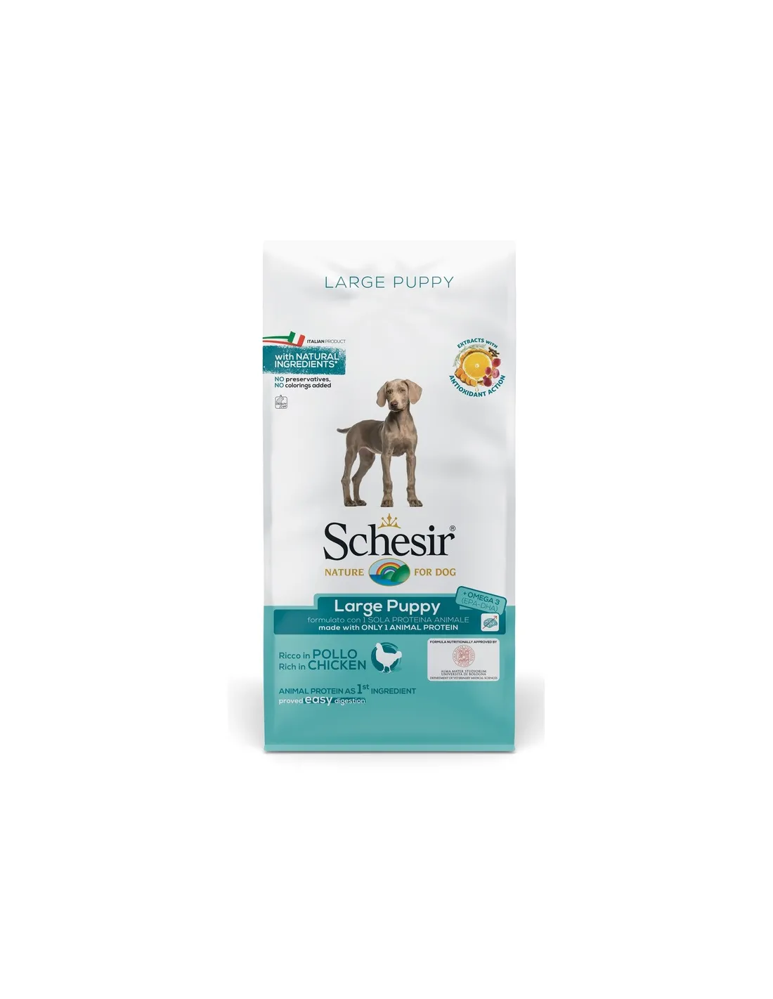 Schesir pienso para cachorros de razas grandes con sabor a pollo es un alimento completo y equilibrado, diseñado para cubrir las necesidades nutricionales de los perros en crecimiento. Las croquetas han sido formuladas para favorecer el desarrollo saludable de huesos y articulaciones, esenciales para perros grandes. Cada bolsa contiene 12 kg de comida, lo que garantiza un suministro suficiente para tu fiel amigo de cuatro patas.