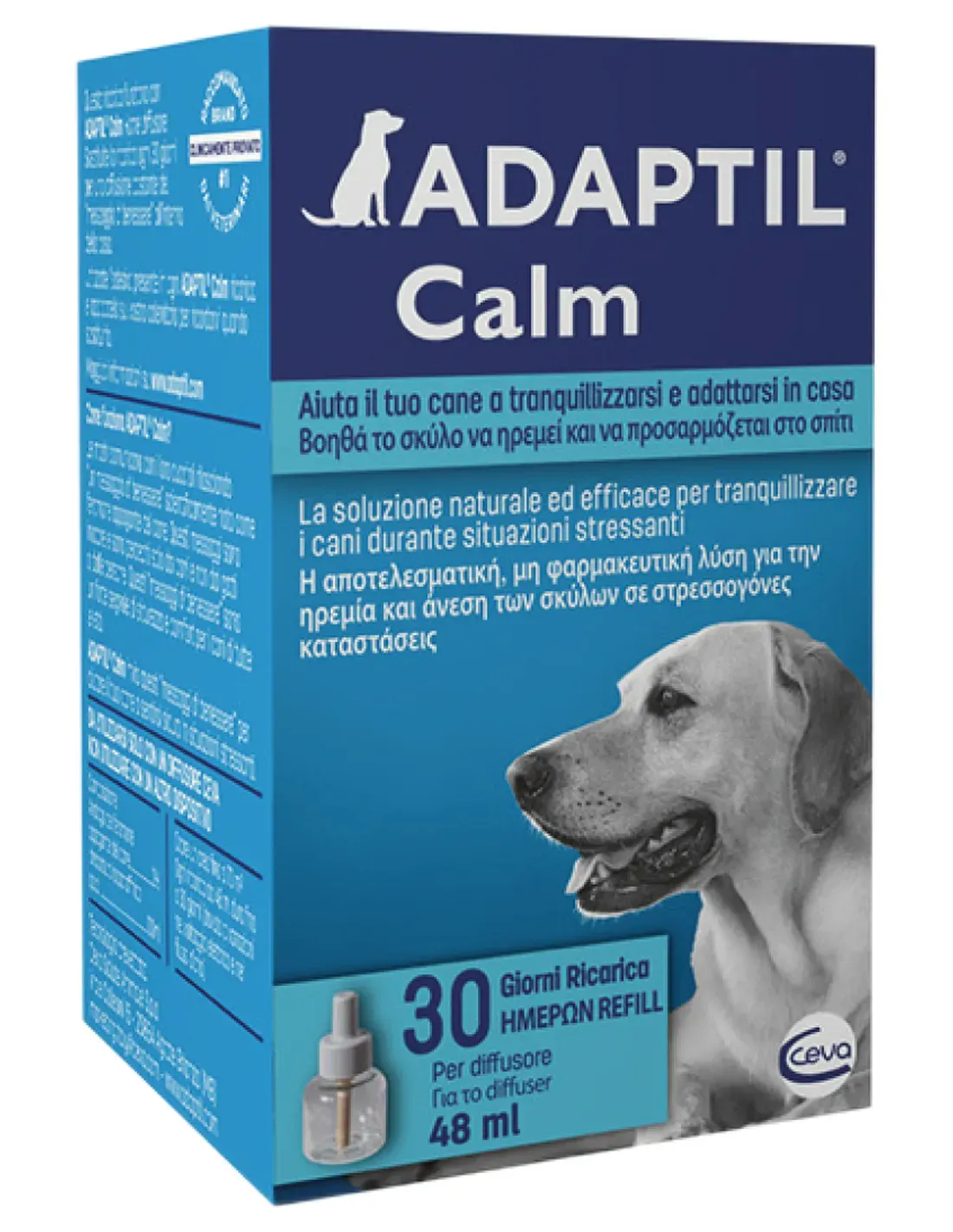 El difusor Adaptil contiene d.a.p. y previene y controla el estrés en cachorros y perros adultos, ayudándoles a afrontar: situaciones desafiantes (fuegos artificiales, ruidos fuertes, tormentas, estar solo en casa, etc.); situaciones nuevas (adopción de cachorros o perros adultos, nuevo hogar, inserción en una familia, casa de vacaciones). El uso combinado de difusor adaptil y collar adaptil o spray adaptil puede ayudar a obtener mejores resultados en perros que muestran miedos en diferentes situaciones (ver tabla en el prospecto)