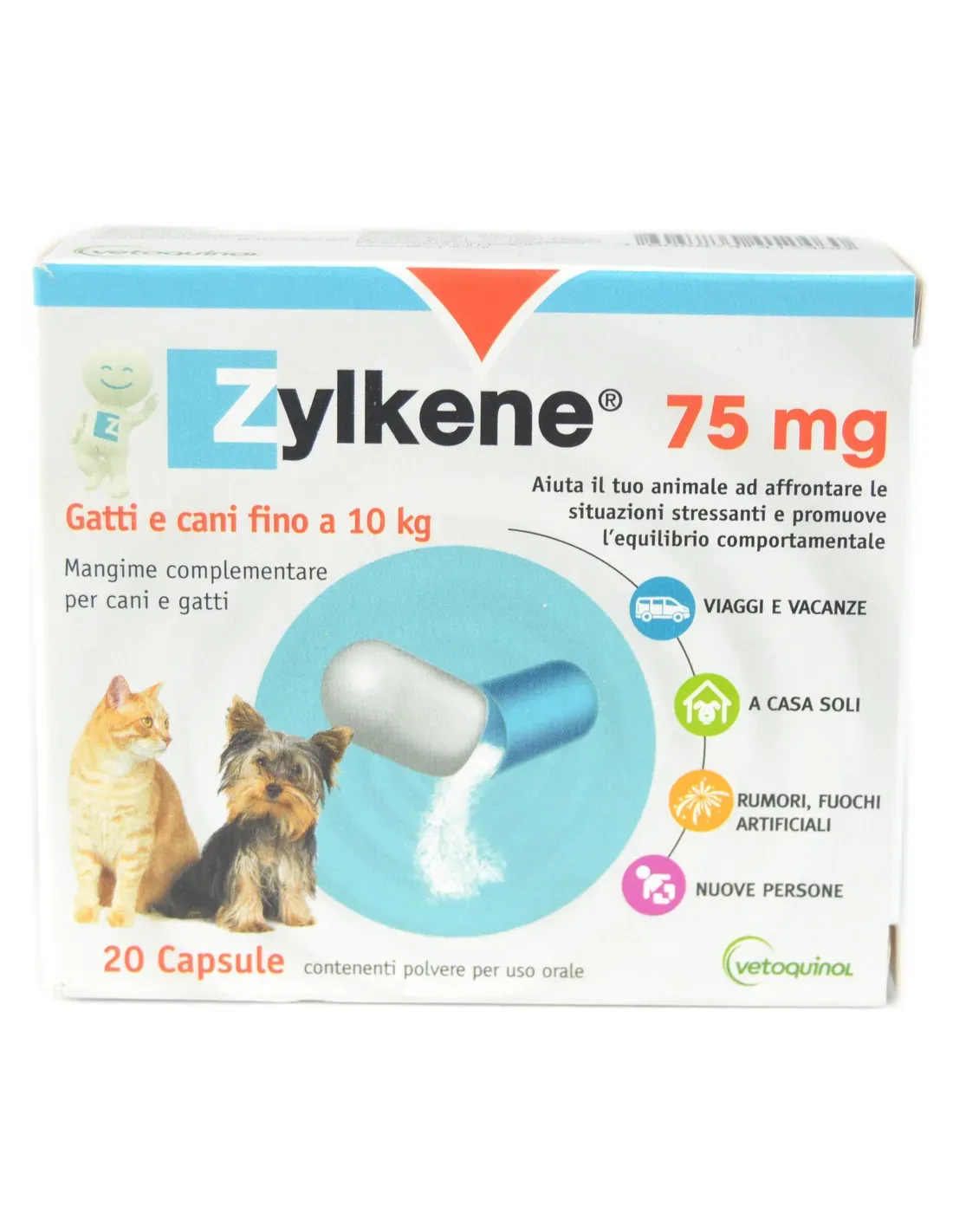 Administrar en perros y gatos sometidos a situaciones inusuales o ante situaciones como cambios de ambiente, necesidad de dejar al animal solo, presencia de extraños o animales desconocidos, lactancia, destete, viajes, fuegos artificiales o en cualquier circunstancia se altere la rutina del animal. Zylkene no sustituye a una dieta normal y equilibrada. A las dosis recomendadas, no se han asociado efectos secundarios con el uso diario del producto.
