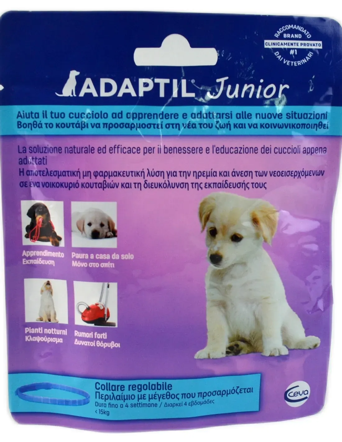 El collar Adaptil Junior Ceva está específicamente indicado para apoyar el bienestar conductual de los cachorros de perros, especialmente durante los periodos de transición y adaptación a nuevos entornos o situaciones estresantes. Es útil para aliviar estados de ansiedad por separación, estrés de adaptación, miedo a sonidos fuertes como fuegos artificiales, tormentas, viajes o visitas al veterinario. Su acción se basa en la difusión de feromonas apicales maternas sintéticas, que imitan las producidas por la madre para transmitir seguridad y calma.