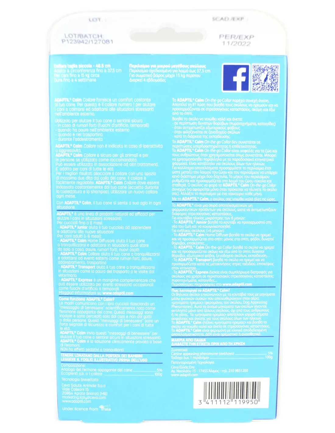 El collar adaptil contiene d.a.p. (feromona canina saciante) y previene y controla el estrés en cachorros y perros adultos, ayudándoles a afrontar situaciones como: ruidos fuertes como tormentas, tráfico, etc., estancia en perreras o pensiones, viajes, situaciones nuevas (nuevo hogar, incorporación a una familia, casa de vacaciones). Se ha demostrado que el collar adaptil ayuda a los cachorros a aprender y mejorar su adaptación al estilo de vida moderno. El collar adaptil también proporciona una ayuda válida para la prevención de los problemas de conducta provocados por el estrés que pueden aparecer en la edad adulta. No se recomienda el uso del collar adaptil en caso de hiperactividad o agresión.