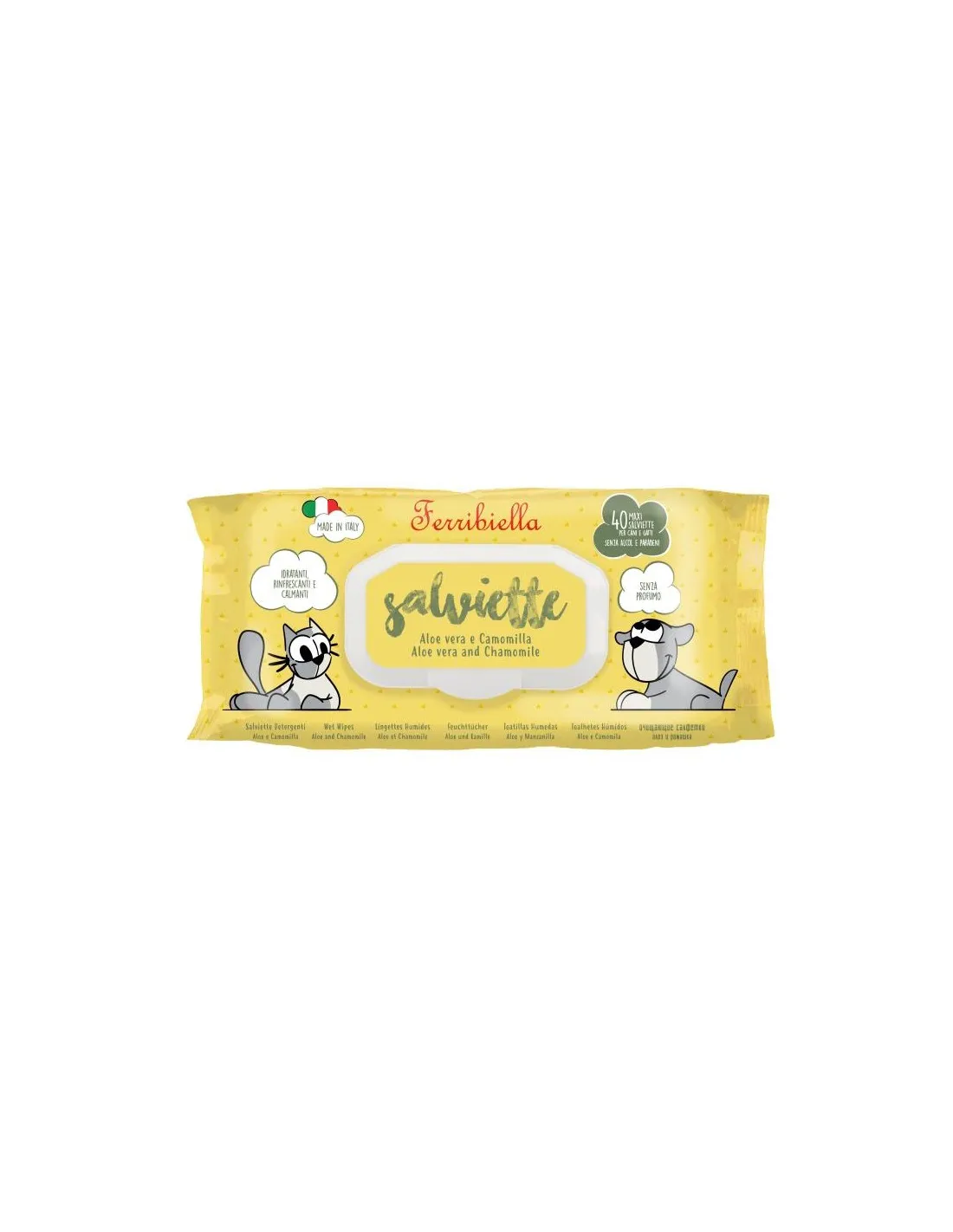 Las toallitas no contienen alcohol y están enriquecidas con Aloe Vera, lo que ofrece no sólo una limpieza eficaz sino también una acción emoliente y protectora. Tras su uso, el pelaje del animal no sólo queda limpio sino también suave, brillante y agradablemente perfumado, gracias a la fragancia fresca que caracteriza al producto.