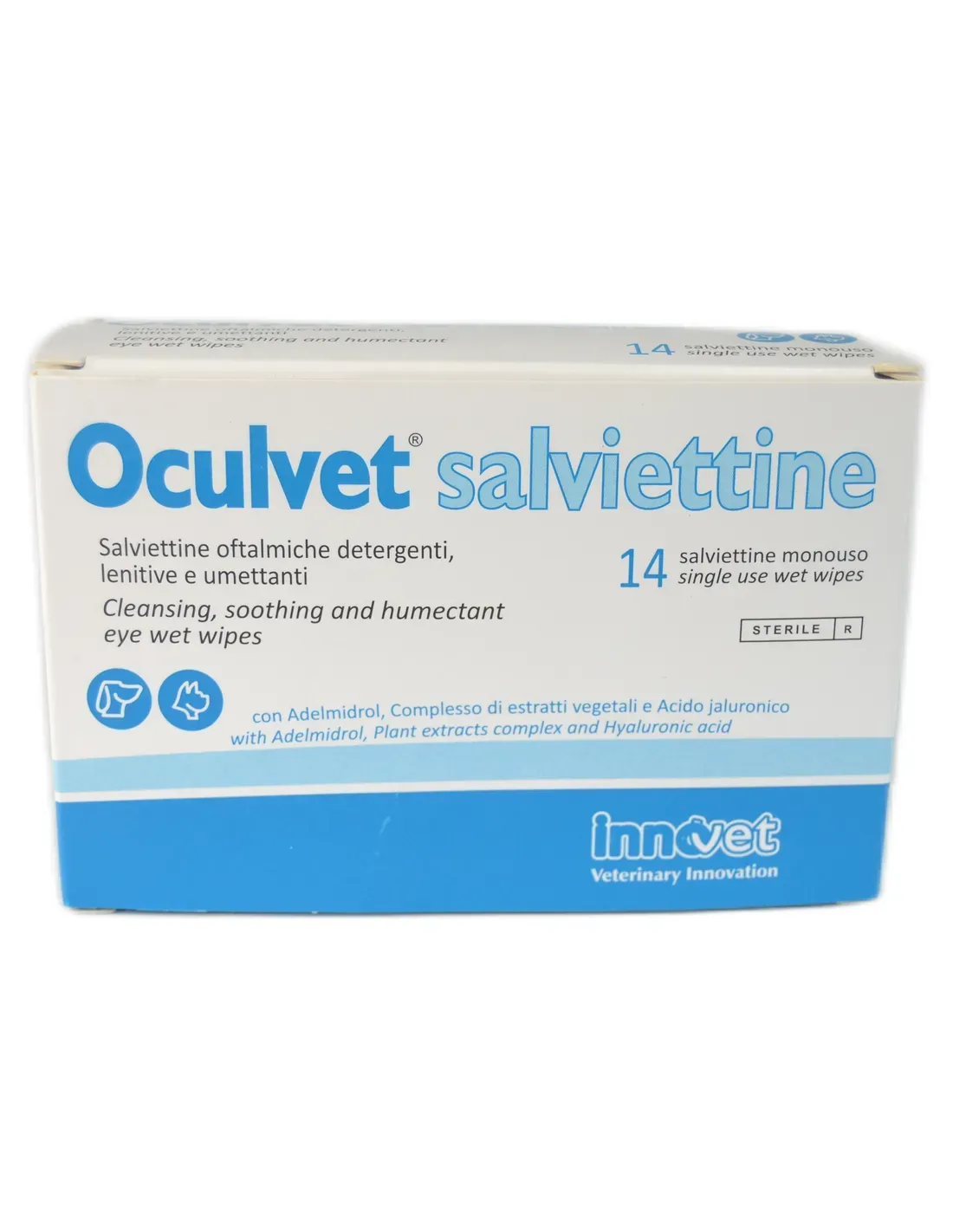 Toallitas oftálmicas limpiadoras, calmantes y humectantes para la limpieza de la zona del contorno de ojos (p. ej. párpados, pestañas) de perros y gatos. Especialmente indicado para eliminar las secreciones oculares en sujetos que padecen diversos tipos de trastornos oftálmicos, limitando la coloración del cabello asociada al lagrimeo abundante (por ejemplo, epífora) y eliminando irritantes y alérgenos (por ejemplo, polvo, polen). También se puede utilizar antes de aplicar colirios, geles o pomadas oftálmicas y para la limpieza periocular pre y posquirúrgica. El adelmidrol, análogo de la palmitoiletanolamida, mantiene el correcto funcionamiento de la piel y de las mucosas perioculares llevando a cabo una acción calmante y antirojeces. El complejo de extractos de plantas* específicamente seleccionados por su acción emoliente y limpiadora ayuda a mantener una correcta higiene del contorno de ojos. El ácido hialurónico confiere a las toallitas Oculvet® una acción humectante e hidratante prolongada. * althaea officinalis, passiflora quadrangularis, verbena officinalis, melissa officinalis, schisandra chinensis, tilia cordata.