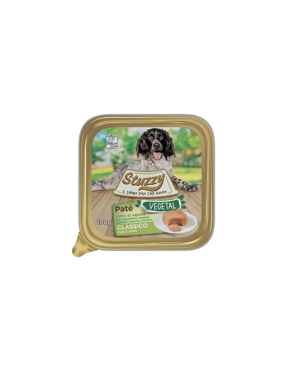 Stuzzy Vegetal Paté está disponible en prácticos tarrinas de 100 g, fáciles de abrir y servir. El código del producto es 02049500, útil para identificar el producto durante la compra. Este formato es especialmente indicado para quienes quieren porcionar el alimento según las necesidades de su perro, garantizando siempre frescura y sabor.