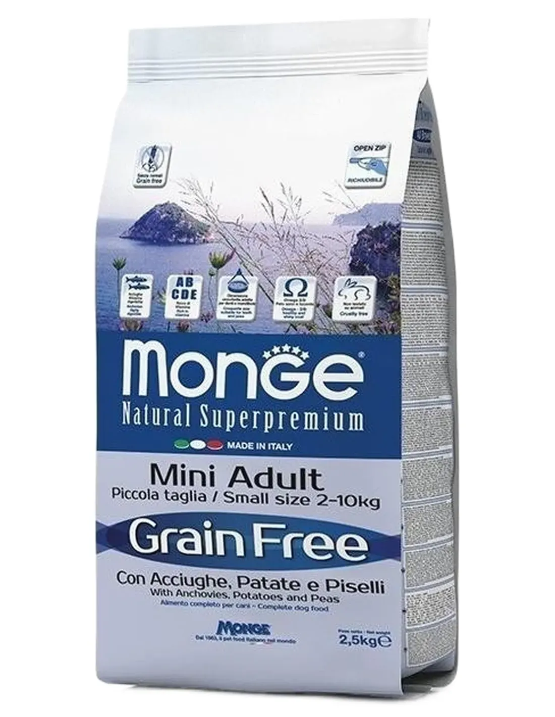 Una receta exclusiva dedicada a perros adultos de pequeño tamaño que se centra íntegramente en el bienestar del animal porque es más cercana a la nutrición en el medio natural, rica en proteínas y sin cereales. Altamente digerible y palatable, Monge Grain Free Mini Adult con Anchoas, Patatas y Guisantes tiene un alto valor proteico. Contiene pescado seleccionado exclusivamente para estos productos y no utilizado para otras líneas. El producto está libre de colorantes y conservantes, tiene un excelente ratio Omega-3 y Omega-6, Ginseng para una acción antienvejecimiento, Condroitina y Glucosamina para el bienestar de las articulaciones y Algas Marinas que aportan un aporte natural de Calcio y Vitamina B12.
