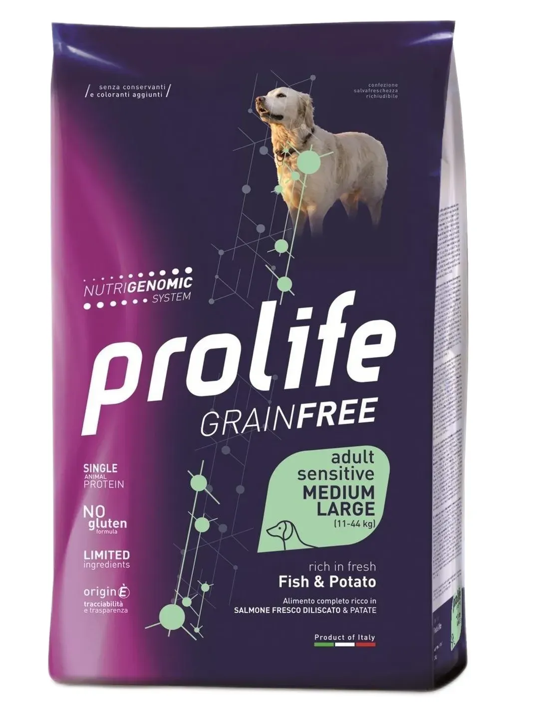 Composición: Salmón 44% (del cual salmón fresco deshuesado* 32%, salmón deshidratado 12%), patatas 25,7%, almidón de patata, pulpa de remolacha, grasa de pollo, proteína de patata, proteína hidrolizada de salmón, Alltech® Nutrigenomic System Adult Dog 1,2%, algarroba en polvo, inulina de achicoria - fuente de FOS - 0,1%, Sustancias minerales, Glucosamina 0,037%, Sulfato de condroitina 0,026%.