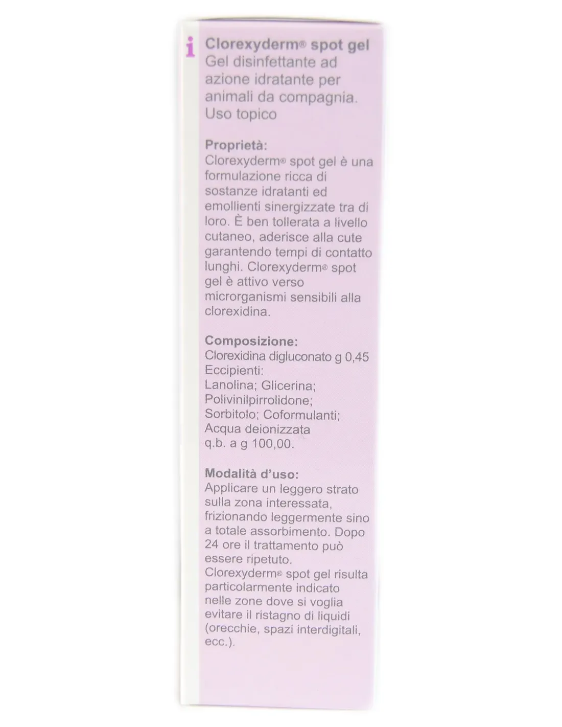 Gel desinfectante hidratante para mascotas. Clorexyderm spot gel es una formulación rica en sustancias hidratantes y emolientes sinérgicas entre sí. Es bien tolerado a nivel cutáneo, se adhiere a la piel asegurando largos tiempos de contacto. Clorexyderm spot gel es activo contra microorganismos sensibles a la clorhexidina.